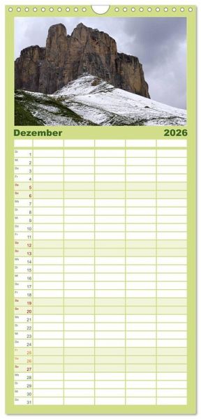 it 5 Spalten für bis zu 5 Personen für mehr Struktur im Alltag - so bleiben alle Termine im Blick!ÜBERSICHTLICH - mit farblich getrennten Wochen- und Feiertagen. Die einzelnen Felder bieten genügend Platz für Eintragungen. So macht Organisieren Spaß!FANTASTISCHE BILDER - Dieser Planer ist nicht nur eine nützliche Hilfe im Alltag, sondern schmückt gleichzeitig Ihr Zuhause. Ideal auch als Geschenk.FÜR ALLE STIFTE GEEIGNET - ganz egal, ob Sie lieber mit Kugelschreiber oder Bleistift schreiben.NACHHALTIG - deutliche Abfallreduzierung durch bedarfsgerechte Einzelstückfertigung, umweltfreundliches FSC-zertifiziertes Papier, Produktion in Deutschland, klimabewusste Logistik.Wandkalender Südtiroler Landschaften von Autor(in): Thilo Seidel