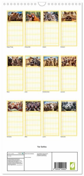 PRAKTISCH - übersichtlicher Familienkalender mit 5 Spalten für bis zu 5 Personen für mehr Struktur im Alltag - so bleiben alle Termine im Blick!ÜBERSICHTLICH - mit farblich getrennten Wochen- und Feiertagen. Die einzelnen Felder bieten genügend Platz für Eintragungen. So macht Organisieren Spaß!FANTASTISCHE BILDER - Dieser Planer ist nicht nur eine nützliche Hilfe im Alltag, sondern schmückt gleichzeitig Ihr Zuhause. Ideal auch als Geschenk.FÜR ALLE STIFTE GEEIGNET - ganz egal, ob Sie lieber mit Kugelschreiber oder Bleistift schreiben.NACHHALTIG - deutliche Abfallreduzierung durch bedarfsgerechte Einzelstückfertigung, umweltfreundliches FSC-zertifiziertes Papier, Produktion in Deutschland, klimabewusste Logistik.Die Tiere sagen Hallo - der Tier Selfie Kalender von Autor(in): Charles Schrader