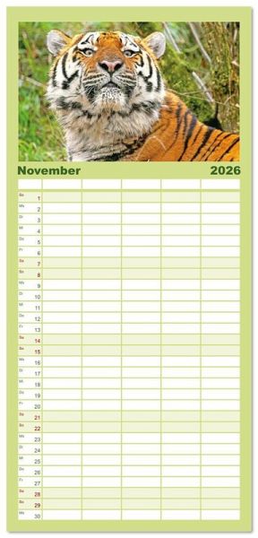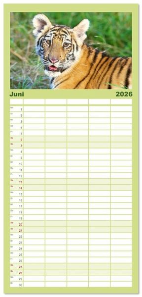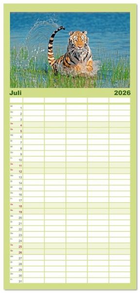 PRAKTISCH - übersichtlicher Familienkalender mit 5 Spalten für bis zu 5 Personen für mehr Struktur im Alltag - so bleiben alle Termine im Blick!ÜBERSICHTLICH - mit farblich getrennten Wochen- und Feiertagen. Die einzelnen Felder bieten genügend Platz für Eintragungen. So macht Organisieren Spaß!FANTASTISCHE BILDER - Dieser Planer ist nicht nur eine nützliche Hilfe im Alltag, sondern schmückt gleichzeitig Ihr Zuhause. Ideal auch als Geschenk.FÜR ALLE STIFTE GEEIGNET - ganz egal, ob Sie lieber mit Kugelschreiber oder Bleistift schreiben.NACHHALTIG - deutliche Abfallreduzierung durch bedarfsgerechte Einzelstückfertigung, umweltfreundliches FSC-zertifiziertes Papier, Produktion in Deutschland, klimabewusste Logistik.Tiger: die größte Katzenart der Erde lebt in Asien von Autor(in): CALVENDO Verlag