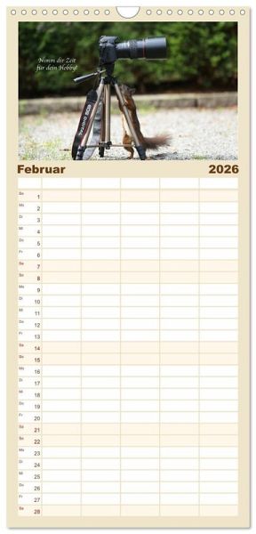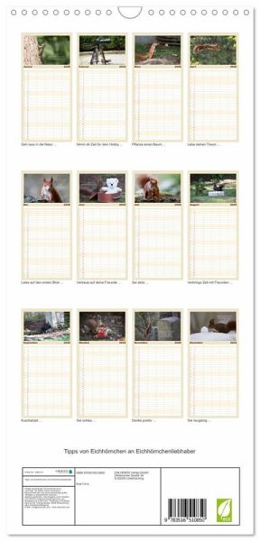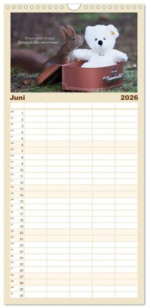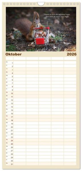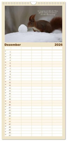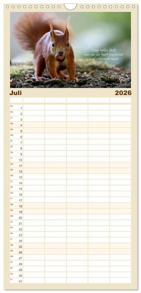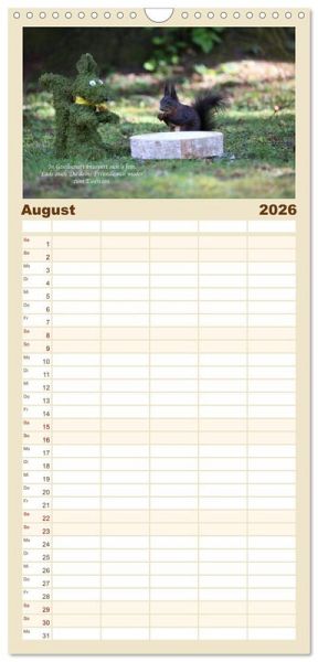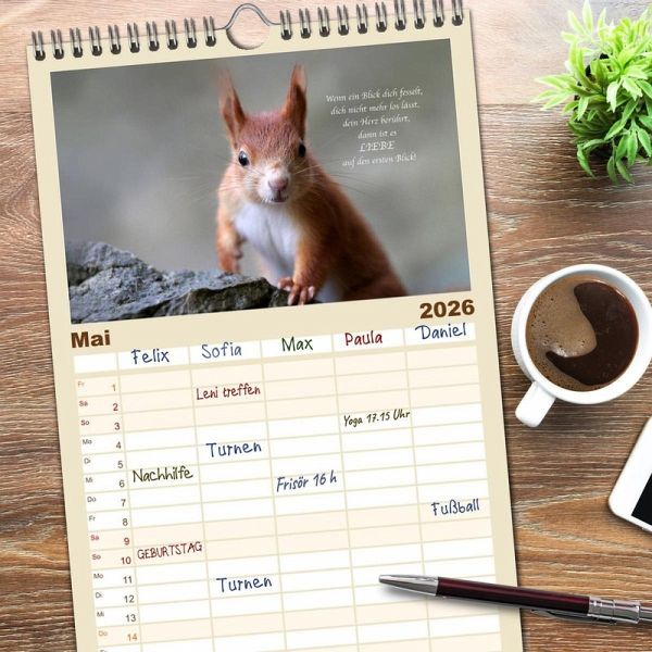 PRAKTISCH - übersichtlicher Familienkalender mit 5 Spalten für bis zu 5 Personen für mehr Struktur im Alltag - so bleiben alle Termine im Blick!ÜBERSICHTLICH - mit farblich getrennten Wochen- und Feiertagen. Die einzelnen Felder bieten genügend Platz für Eintragungen. So macht Organisieren Spaß!FANTASTISCHE BILDER - Dieser Planer ist nicht nur eine nützliche Hilfe im Alltag, sondern schmückt gleichzeitig Ihr Zuhause. Ideal auch als Geschenk.FÜR ALLE STIFTE GEEIGNET - ganz egal, ob Sie lieber mit Kugelschreiber oder Bleistift schreiben.NACHHALTIG - deutliche Abfallreduzierung durch bedarfsgerechte Einzelstückfertigung, umweltfreundliches FSC-zertifiziertes Papier, Produktion in Deutschland, klimabewusste Logistik.Bilder mit tollen Sprüchen von Eichhörnchen. von Autor(in): Birgit Cerny
