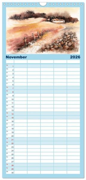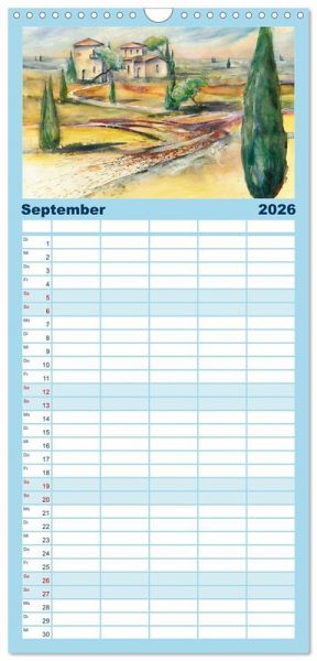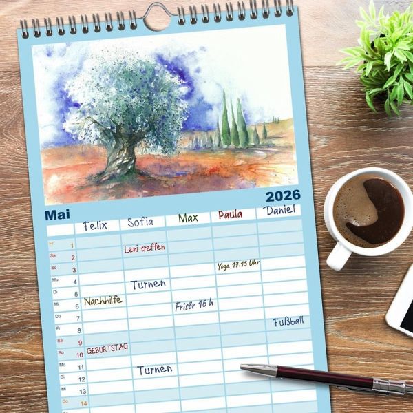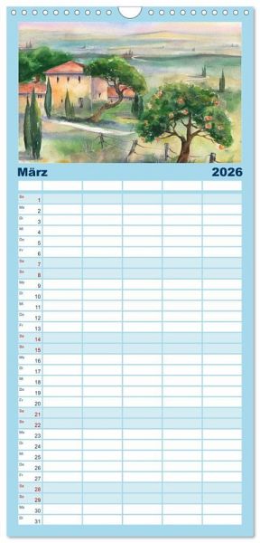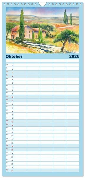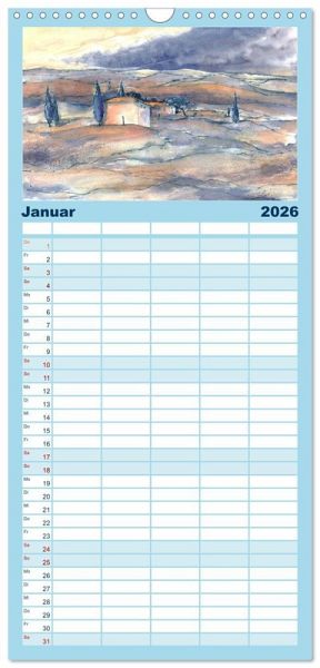 tlicher Familienkalender mit 5 Spalten für bis zu 5 Personen für mehr Struktur im Alltag - so bleiben alle Termine im Blick!ÜBERSICHTLICH - mit farblich getrennten Wochen- und Feiertagen. Die einzelnen Felder bieten genügend Platz für Eintragungen. So macht Organisieren Spaß!FANTASTISCHE BILDER - Dieser Planer ist nicht nur eine nützliche Hilfe im Alltag, sondern schmückt gleichzeitig Ihr Zuhause. Ideal auch als Geschenk.FÜR ALLE STIFTE GEEIGNET - ganz egal, ob Sie lieber mit Kugelschreiber oder Bleistift schreiben.NACHHALTIG - deutliche Abfallreduzierung durch bedarfsgerechte Einzelstückfertigung, umweltfreundliches FSC-zertifiziertes Papier, Produktion in Deutschland, klimabewusste Logistik.Landschaftsaquarelle der Toskana von Autor(in): Jitka Krause