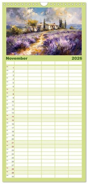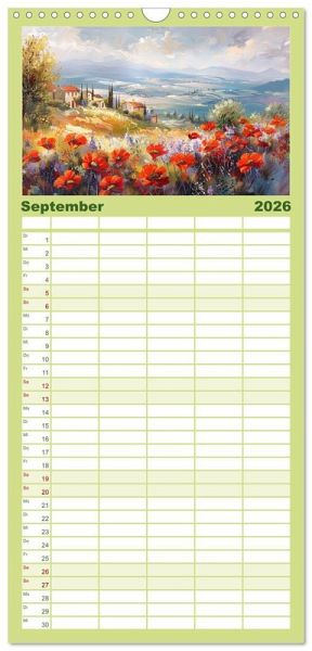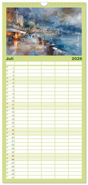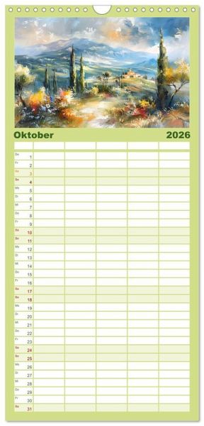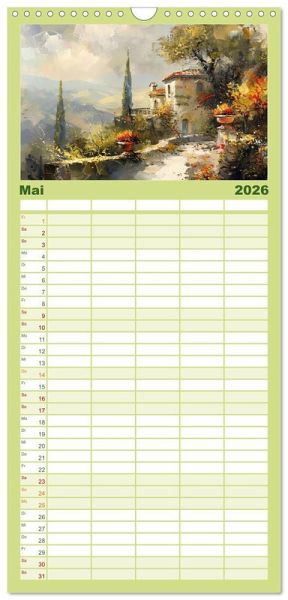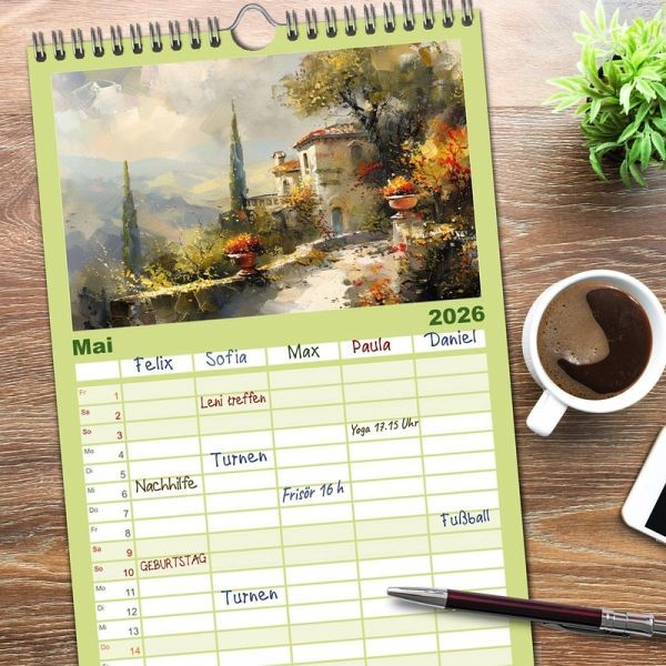 PRAKTISCH - übersichtlicher Familienkalender mit 5 Spalten für bis zu 5 Personen für mehr Struktur im Alltag - so bleiben alle Termine im Blick!ÜBERSICHTLICH - mit farblich getrennten Wochen- und Feiertagen. Die einzelnen Felder bieten genügend Platz für Eintragungen. So macht Organisieren Spaß!FANTASTISCHE BILDER - Dieser Planer ist nicht nur eine nützliche Hilfe im Alltag, sondern schmückt gleichzeitig Ihr Zuhause. Ideal auch als Geschenk.FÜR ALLE STIFTE GEEIGNET - ganz egal, ob Sie lieber mit Kugelschreiber oder Bleistift schreiben.NACHHALTIG - deutliche Abfallreduzierung durch bedarfsgerechte Einzelstückfertigung, umweltfreundliches FSC-zertifiziertes Papier, Produktion in Deutschland, klimabewusste Logistik.Der malerische Charme desSüdens - KI generiert von Autor(in): Catill