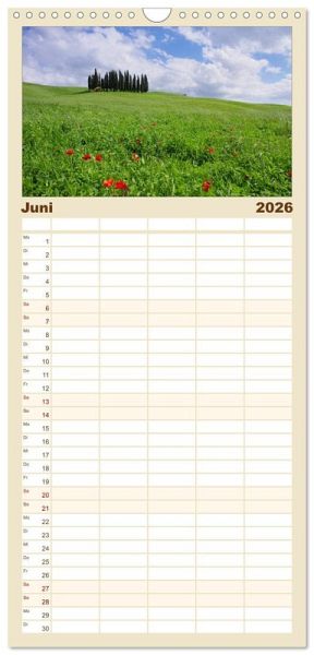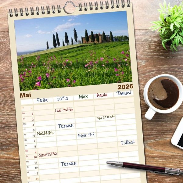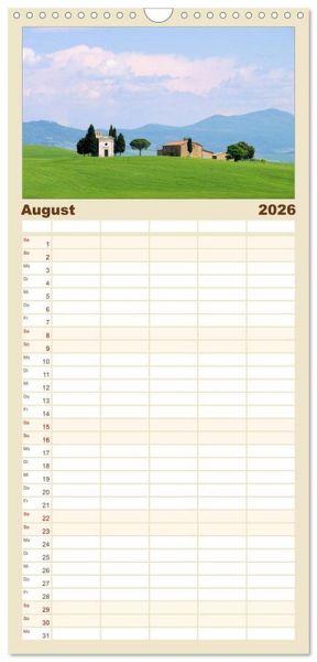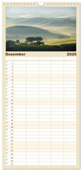 PRAKTISCH - übersichtlicher Familienkalender mit 5 Spalten für bis zu 5 Personen für mehr Struktur im Alltag - so bleiben alle Termine im Blick!ÜBERSICHTLICH - mit farblich getrennten Wochen- und Feiertagen. Die einzelnen Felder bieten genügend Platz für Eintragungen. So macht Organisieren Spaß!FANTASTISCHE BILDER - Dieser Planer ist nicht nur eine nützliche Hilfe im Alltag, sondern schmückt gleichzeitig Ihr Zuhause. Ideal auch als Geschenk.FÜR ALLE STIFTE GEEIGNET - ganz egal, ob Sie lieber mit Kugelschreiber oder Bleistift schreiben.NACHHALTIG - deutliche Abfallreduzierung durch bedarfsgerechte Einzelstückfertigung, umweltfreundliches FSC-zertifiziertes Papier, Produktion in Deutschland, klimabewusste Logistik.Eine der bezauberndsten Landschaften Italiens ist ohne Zweifel die Toskana. von Autor(in): Thomas Polske