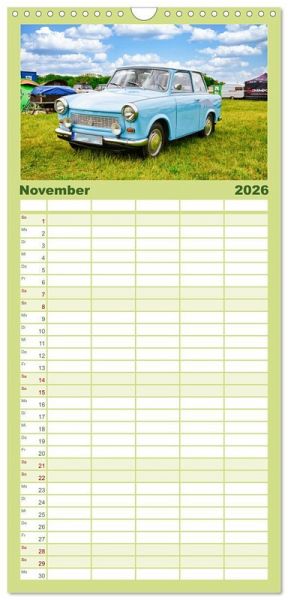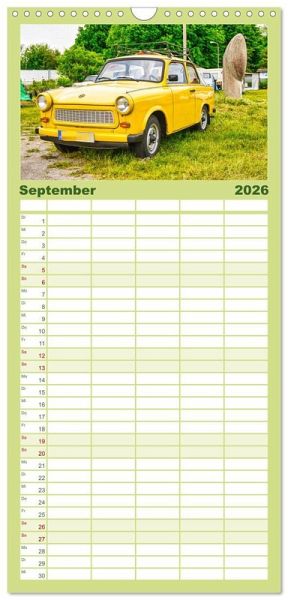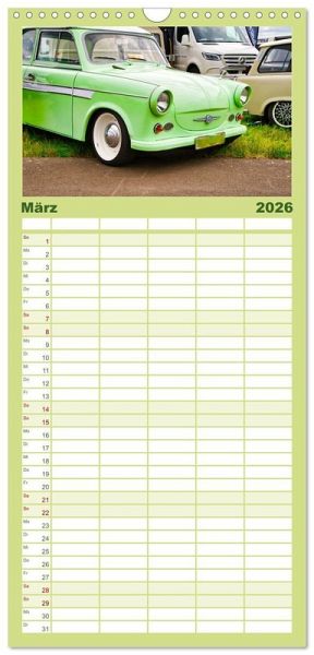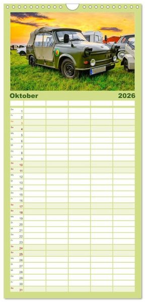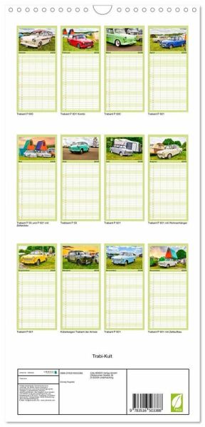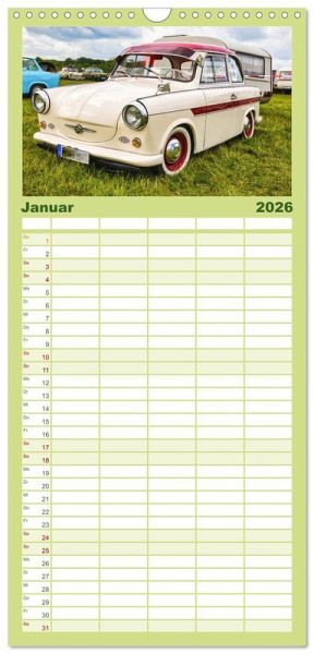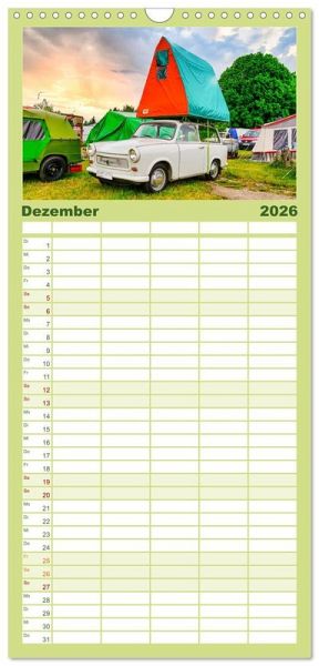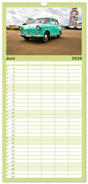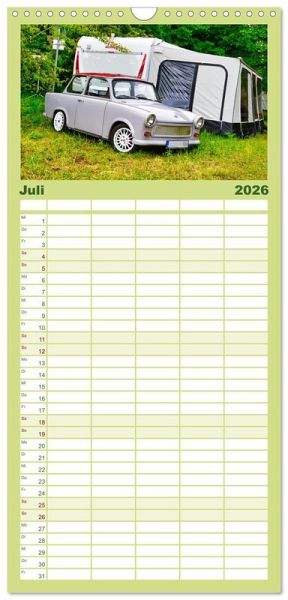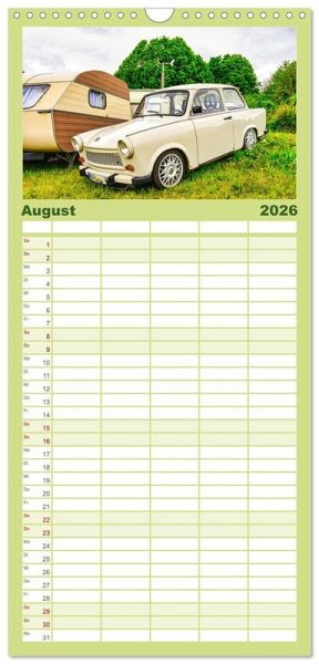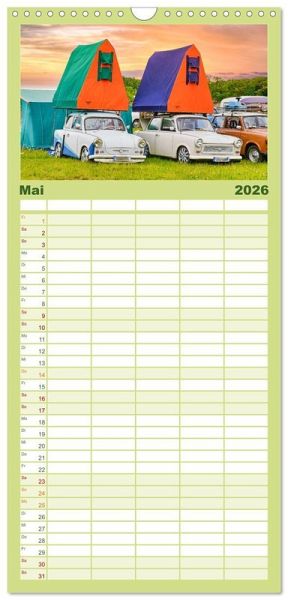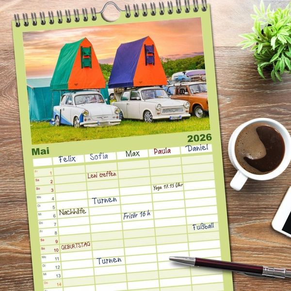 PRAKTISCH - übersichtlicher Familienkalender mit 5 Spalten für bis zu 5 Personen für mehr Struktur im Alltag - so bleiben alle Termine im Blick!ÜBERSICHTLICH - mit farblich getrennten Wochen- und Feiertagen. Die einzelnen Felder bieten genügend Platz für Eintragungen. So macht Organisieren Spaß!FANTASTISCHE BILDER - Dieser Planer ist nicht nur eine nützliche Hilfe im Alltag, sondern schmückt gleichzeitig Ihr Zuhause. Ideal auch als Geschenk.FÜR ALLE STIFTE GEEIGNET - ganz egal, ob Sie lieber mit Kugelschreiber oder Bleistift schreiben.NACHHALTIG - deutliche Abfallreduzierung durch bedarfsgerechte Einzelstückfertigung, umweltfreundliches FSC-zertifiziertes Papier, Produktion in Deutschland, klimabewusste Logistik.Der Trabi prägte das Bild der Straßen in der DDR. Jetzt ist er das Kultauto im Osten! von Autor(in): Solveig Rogalski