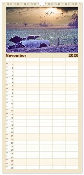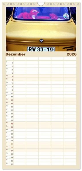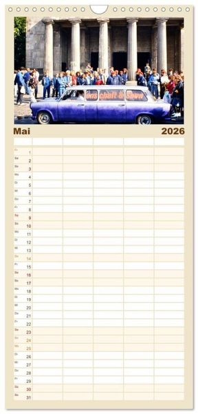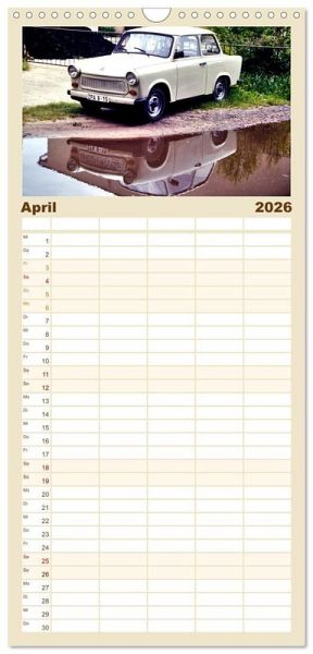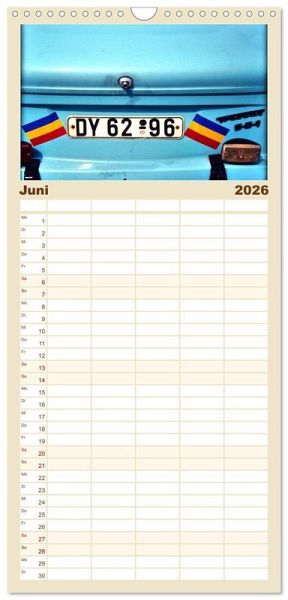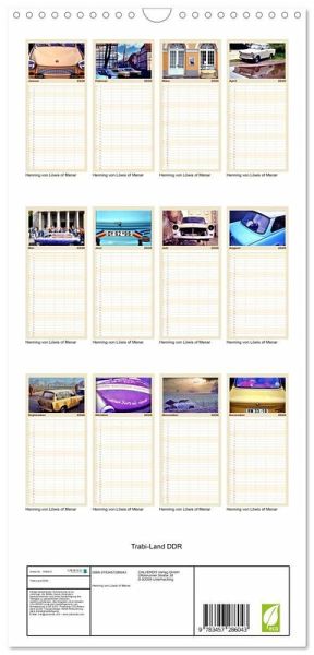 PRAKTISCH - übersichtlicher Familienkalender mit 5 Spalten für bis zu 5 Personen für mehr Struktur im Alltag - so bleiben alle Termine im Blick!ÜBERSICHTLICH - mit farblich getrennten Wochen- und Feiertagen. Die einzelnen Felder bieten genügend Platz für Eintragungen. So macht Organisieren Spaß!FANTASTISCHE BILDER - Dieser Planer ist nicht nur eine nützliche Hilfe im Alltag, sondern schmückt gleichzeitig Ihr Zuhause. Ideal auch als Geschenk.FÜR ALLE STIFTE GEEIGNET - ganz egal, ob Sie lieber mit Kugelschreiber oder Bleistift schreiben.NACHHALTIG - deutliche Abfallreduzierung durch bedarfsgerechte Einzelstückfertigung, umweltfreundliches FSC-zertifiziertes Papier, Produktion in Deutschland, klimabewusste Logistik.PKW der Marke Trabant in der DDR von Autor(in): Henning von Loewis of Menar