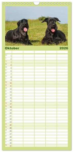 n. So macht Organisieren Spaß!FANTASTISCHE BILDER - Dieser Planer ist nicht nur eine nützliche Hilfe im Alltag, sondern schmückt gleichzeitig Ihr Zuhause. Ideal auch als Geschenk.FÜR ALLE STIFTE GEEIGNET - ganz egal, ob Sie lieber mit Kugelschreiber oder Bleistift schreiben.NACHHALTIG - deutliche Abfallreduzierung durch bedarfsgerechte Einzelstückfertigung, umweltfreundliches FSC-zertifiziertes Papier, Produktion in Deutschland, klimabewusste Logistik.Riesenschnauzer, eine imposante Hunderasse auf 13 wundervollen Bildern von Autor(in): SiSta-Tierfoto