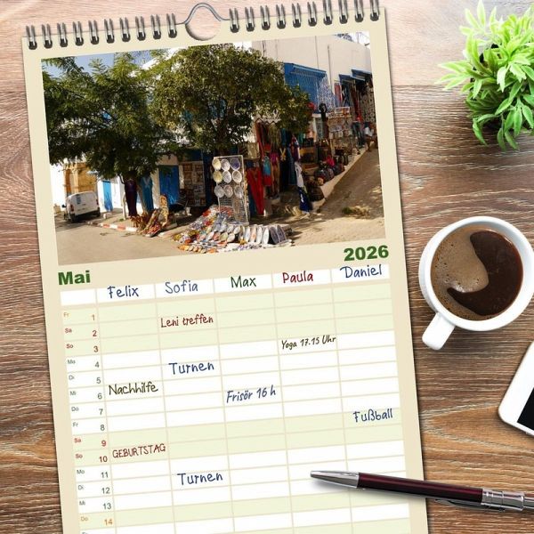 PRAKTISCH - übersichtlicher Familienkalender mit 5 Spalten für bis zu 5 Personen für mehr Struktur im Alltag - so bleiben alle Termine im Blick!ÜBERSICHTLICH - mit farblich getrennten Wochen- und Feiertagen. Die einzelnen Felder bieten genügend Platz für Eintragungen. So macht Organisieren Spaß!FANTASTISCHE BILDER - Dieser Planer ist nicht nur eine nützliche Hilfe im Alltag, sondern schmückt gleichzeitig Ihr Zuhause. Ideal auch als Geschenk.FÜR ALLE STIFTE GEEIGNET - ganz egal, ob Sie lieber mit Kugelschreiber oder Bleistift schreiben.NACHHALTIG - deutliche Abfallreduzierung durch bedarfsgerechte Einzelstückfertigung, umweltfreundliches FSC-zertifiziertes Papier, Produktion in Deutschland, klimabewusste Logistik.Anspruchsvolle Fotografien von Cristina Wilson auf ihrer Reise durch eines der aufregendsten Länder Nordafrikas von Autor(in): cristinawilson