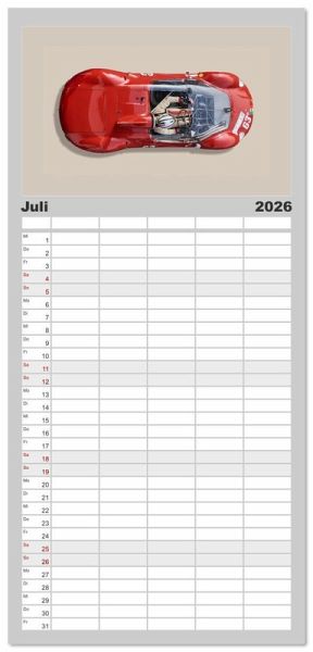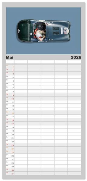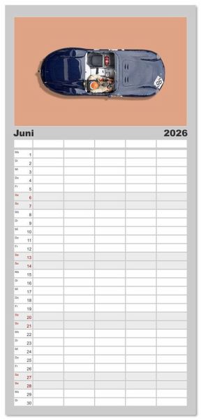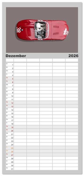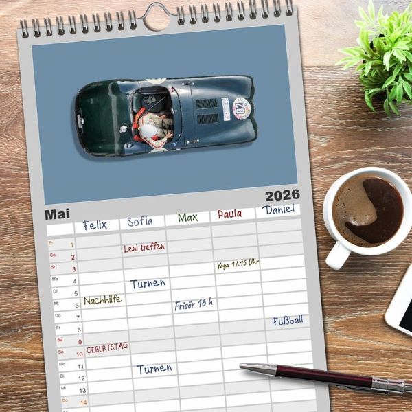 der mit 5 Spalten für bis zu 5 Personen für mehr Struktur im Alltag - so bleiben alle Termine im Blick!ÜBERSICHTLICH - mit farblich getrennten Wochen- und Feiertagen. Die einzelnen Felder bieten genügend Platz für Eintragungen. So macht Organisieren Spaß!FANTASTISCHE BILDER - Dieser Planer ist nicht nur eine nützliche Hilfe im Alltag, sondern schmückt gleichzeitig Ihr Zuhause. Ideal auch als Geschenk.FÜR ALLE STIFTE GEEIGNET - ganz egal, ob Sie lieber mit Kugelschreiber oder Bleistift schreiben.NACHHALTIG - deutliche Abfallreduzierung durch bedarfsgerechte Einzelstückfertigung, umweltfreundliches FSC-zertifiziertes Papier, Produktion in Deutschland, klimabewusste Logistik.Zweisitzige Rennwagen von 1950-1960 von oben von Autor(in): Bernhard Schmerl