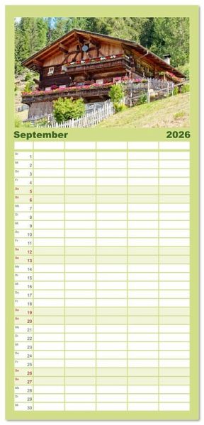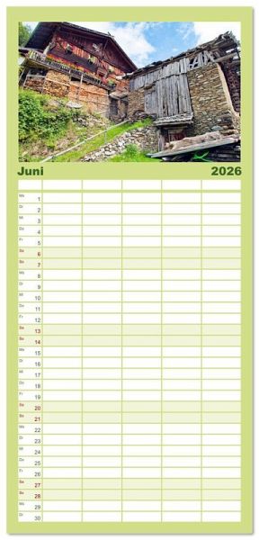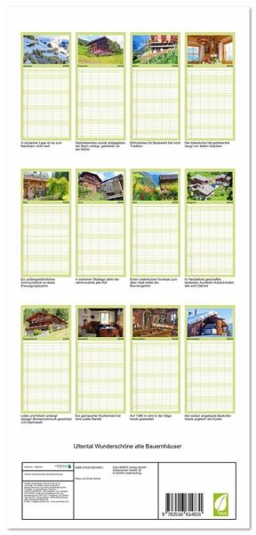 PRAKTISCH - übersichtlicher Familienkalender mit 5 Spalten für bis zu 5 Personen für mehr Struktur im Alltag - so bleiben alle Termine im Blick!ÜBERSICHTLICH - mit farblich getrennten Wochen- und Feiertagen. Die einzelnen Felder bieten genügend Platz für Eintragungen. So macht Organisieren Spaß!FANTASTISCHE BILDER - Dieser Planer ist nicht nur eine nützliche Hilfe im Alltag, sondern schmückt gleichzeitig Ihr Zuhause. Idealauch als Geschenk.FÜR ALLE STIFTE GEEIGNET - ganz egal, ob Sie lieber mit Kugelschreiber oder Bleistift schreiben.NACHHALTIG - deutliche Abfallreduzierung durch bedarfsgerechte Einzelstückfertigung, umweltfreundliches FSC-zertifiziertes Papier, Produktion in Deutschland, klimabewusste Logistik.Wunderschöne alte Bauernhäuser im Südtiroler Ultental bei Meran von Autor(in): Klaus Scholz