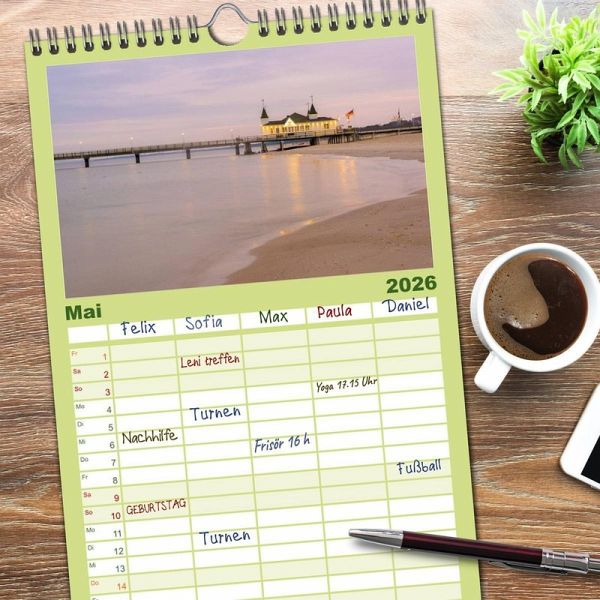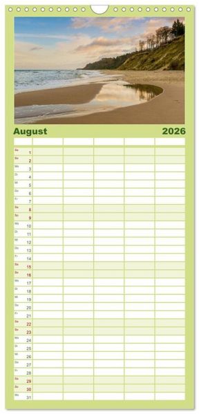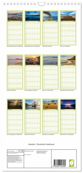 PRAKTISCH - übersichtlicher Familienkalender mit 5 Spalten für bis zu 5 Personen für mehr Struktur im Alltag - so bleiben alle Termine im Blick!ÜBERSICHTLICH - mit farblich getrennten Wochen- und Feiertagen. Die einzelnen Felder bieten genügend Platz für Eintragungen. So macht Organisieren Spaß!FANTASTISCHE BILDER - Dieser Planer ist nicht nur eine nützliche Hilfe im Alltag, sondern schmückt gleichzeitig Ihr Zuhause. Ideal auch als Geschenk.FÜR ALLE STIFTE GEEIGNET - ganz egal, ob Sie lieber mit Kugelschreiber oder Bleistift schreiben.NACHHALTIG - deutliche Abfallreduzierung durch bedarfsgerechte Einzelstückfertigung, umweltfreundliches FSC-zertifiziertes Papier, Produktion in Deutschland, klimabewusste Logistik.Landschaften auf Insel Usedom von Autor(in): Martin Wasilewski