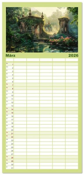 PRAKTISCH - übersichtlicher Familienkalender mit 5 Spalten für bis zu 5 Personen für mehr Struktur im Alltag - so bleiben alle Termine im Blick!ÜBERSICHTLICH - mit farblich getrennten Wochen- und Feiertagen. Die einzelnen Felder bieten genügend Platz für Eintragungen. So macht Organisieren Spaß!FANTASTISCHE BILDER - Dieser Planer ist nicht nur eine nützliche Hilfe im Alltag, sondern schmückt gleichzeitig Ihr Zuhause. Ideal auch als Geschenk.FÜR ALLE STIFTE GEEIGNET - ganz egal, ob Sie lieber mit Kugelschreiber oder Bleistift schreiben.NACHHALTIG - deutliche Abfallreduzierung durch bedarfsgerechte Einzelstückfertigung, umweltfreundliches FSC-zertifiziertes Papier, Produktion in Deutschland, klimabewusste Logistik.Verträumte historische Gartenlandschaften begeleiten Sie durchs Jahr. von Autor(in): Simone Wunderlich