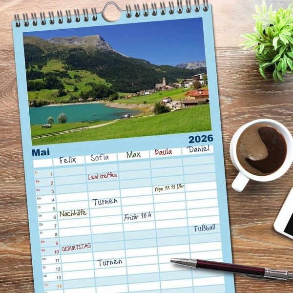 PRAKTISCH - übersichtlicher Familienkalender mit 5 Spalten für bis zu 5 Personen für mehr Struktur im Alltag - so bleiben alle Termine im Blick!ÜBERSICHTLICH - mit farblich getrennten Wochen- und Feiertagen. Die einzelnen Felder bieten genügend Platz für Eintragungen. So macht Organisieren Spaß!FANTASTISCHE BILDER - Dieser Planer ist nicht nur eine nützliche Hilfe im Alltag, sondern schmückt gleichzeitig Ihr Zuhause. Ideal auch als Geschenk.FÜR ALLE STIFTE GEEIGNET - ganz egal, ob Sie lieber mit Kugelschreiber oder Bleistift schreiben.NACHHALTIG - deutliche Abfallreduzierung durch bedarfsgerechte Einzelstückfertigung, umweltfreundliches FSC-zertifiziertes Papier, Produktion in Deutschland, klimabewusste Logistik.Impressionen aus dem oberen Etschtal von Autor(in): Thomas Polske