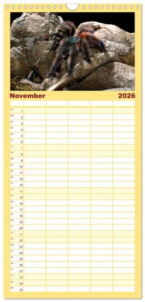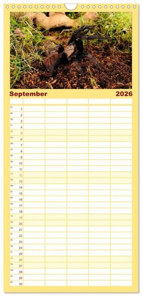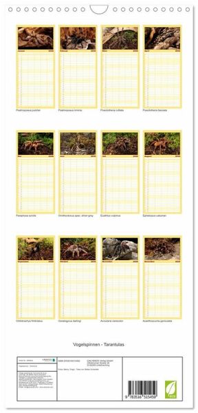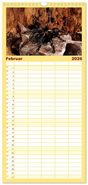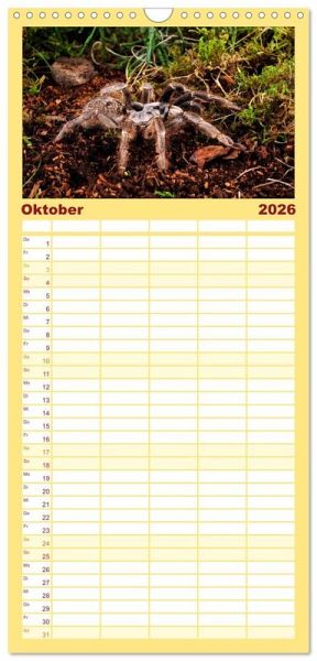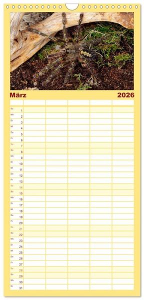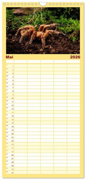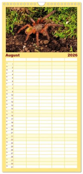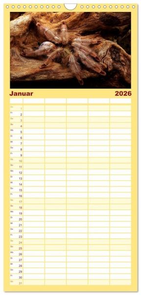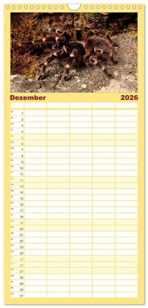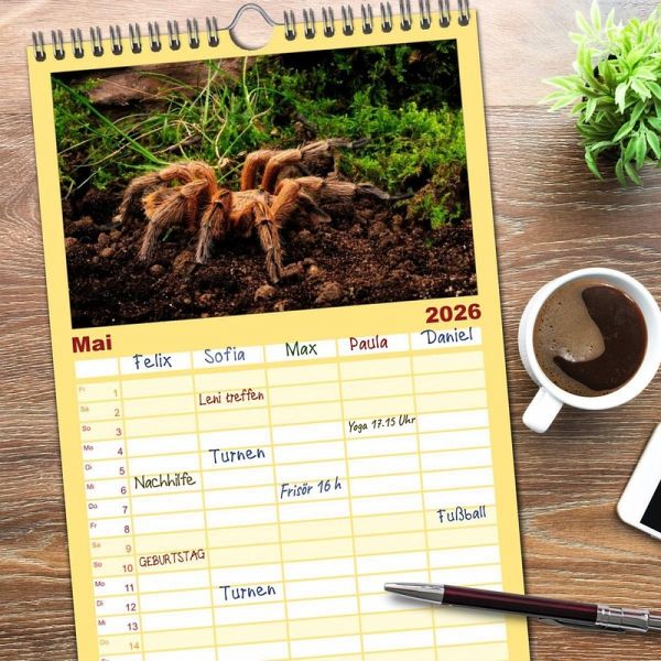 PRAKTISCH - übersichtlicher Familienkalender mit 5 Spalten für bis zu 5 Personen für mehr Struktur im Alltag - so bleiben alle Termine im Blick!ÜBERSICHTLICH - mit farblich getrennten Wochen- und Feiertagen. Die einzelnen Felder bieten genügend Platz für Eintragungen. So macht Organisieren Spaß!FANTASTISCHE BILDER - Dieser Planer ist nicht nur eine nützliche Hilfe im Alltag, sondern schmückt gleichzeitig Ihr Zuhause. Ideal auch als Geschenk.FÜR ALLE STIFTE GEEIGNET - ganz egal, ob Sie lieber mit Kugelschreiber oder Bleistift schreiben.NACHHALTIG - deutliche Abfallreduzierung durch bedarfsgerechte Einzelstückfertigung, umweltfreundliches FSC-zertifiziertes Papier, Produktion in Deutschland, klimabewusste Logistik.Fotokalender mit Vogelspinnen aus aller Welt von Autor(in): Benny Trapp