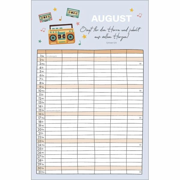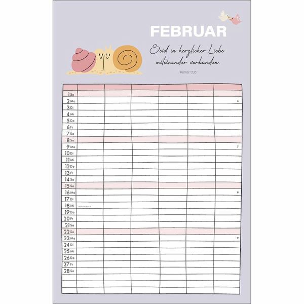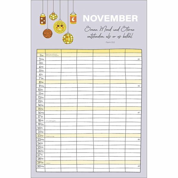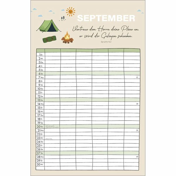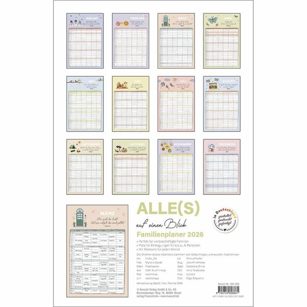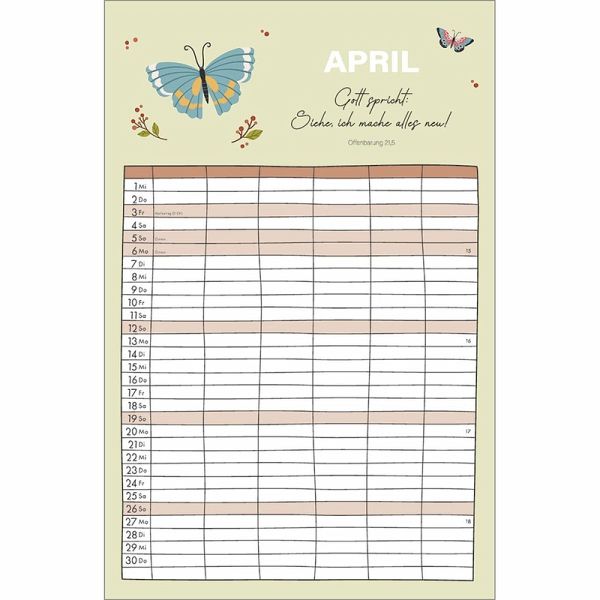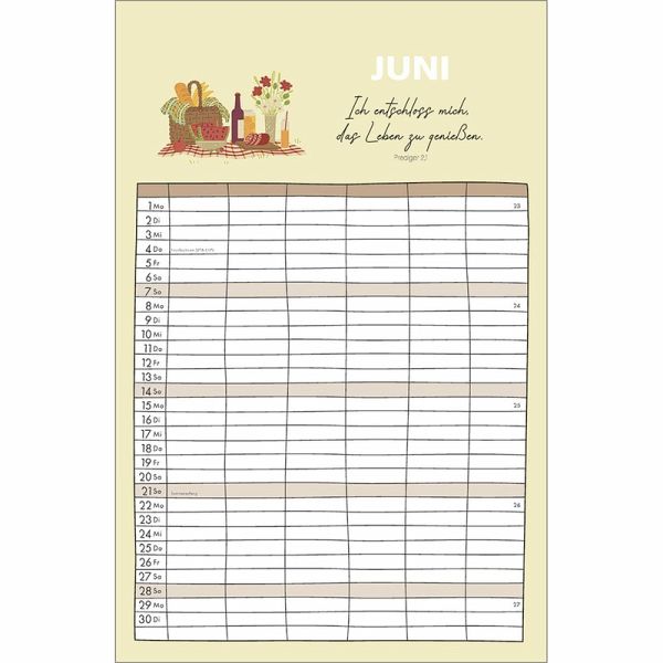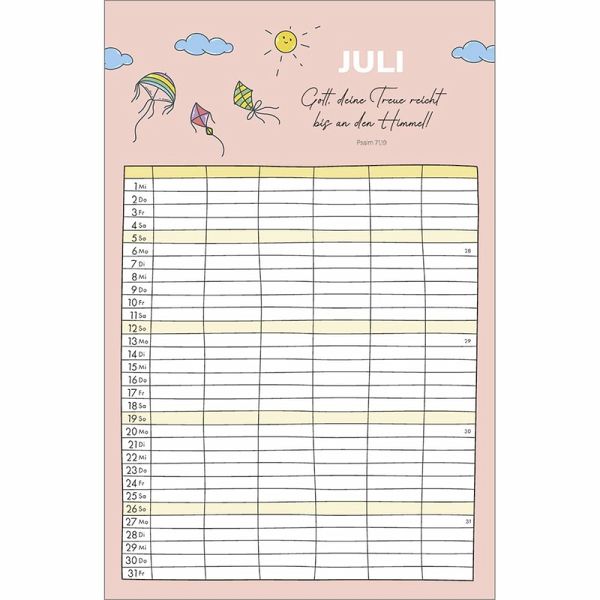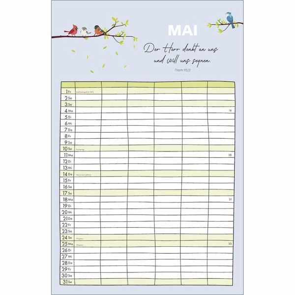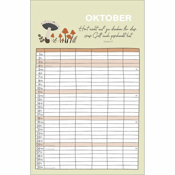Familienplaner - Alle(s) auf einen BlickOrganisation und Inspiration auf einen Blick! Dieser Terminkalender mit sechs geräumigen Spalten schenkt Übersicht über die Aktivitäten der ganzen Familie.Monatliche Bibelversemit heiteren und farbenfrohen Illustrationen sprechen ermutigend in den Alltag.So geht kein Termin verloren und der regelmäßige Blick auf die Planung schenkt ein Lächeln für den Tag.Terminkalender:- Übersichtlicher Terminbereich mit sechs Spalten für "Groß und Klein"- mit Bibelversen und heiteren Illustrationen- Übersicht, auch bei größeren Familien- Schulferien auf Extra-Blatt- 6 geräumige Spalten, gut beschreibbar- ehemals bei SCM