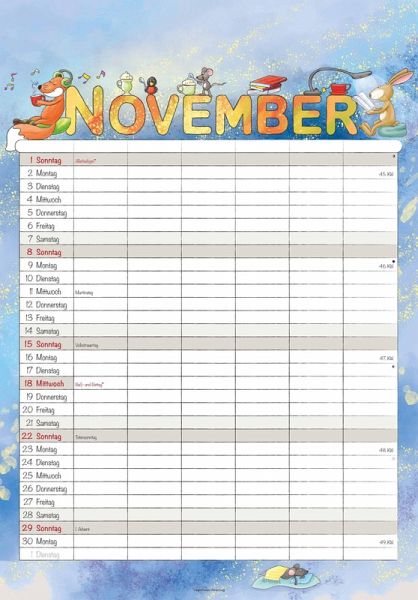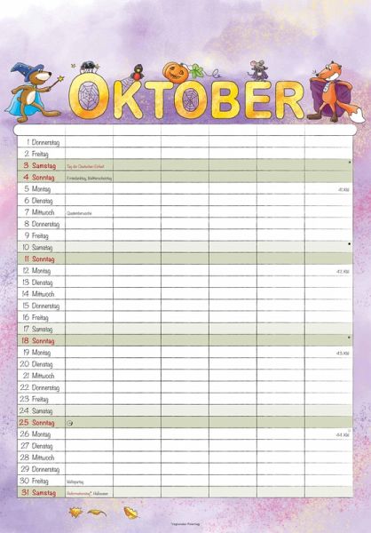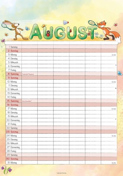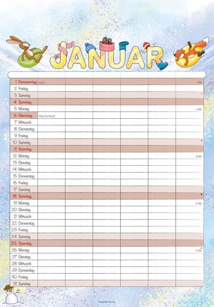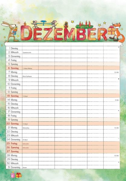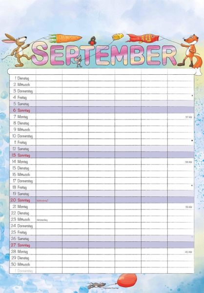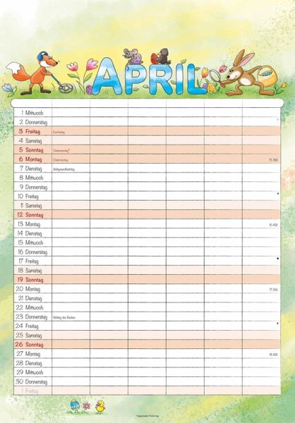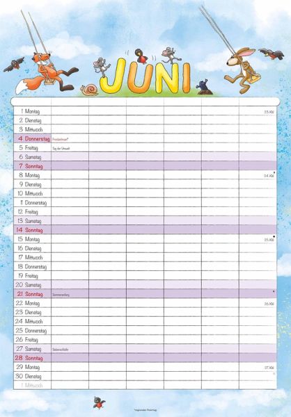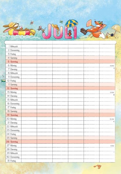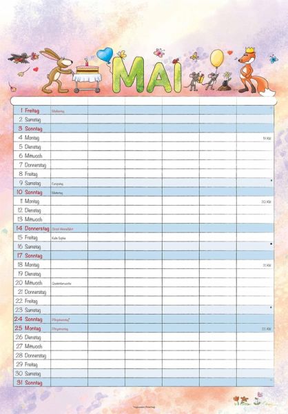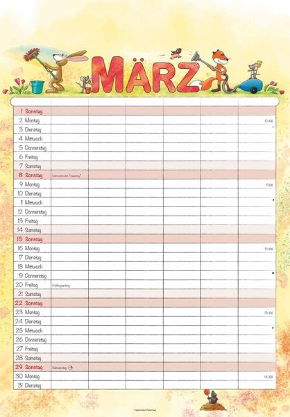 Der mit humorvollen Cartoons illustrierte Wandplaner mit sechs Spalten lässt Sie keinen Termin Ihrer Familie mehr vergessen. Jedes Familienmitglied kann ganz einfach und bequem alle persönlichen Termine eintragen. Der Familienkalender hat die Maße 23,7x34 cm und enthält zusätzlich eine umfangreiche Übersicht über sämtliche Ferientermine.