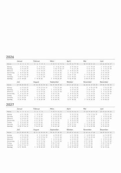 Auf den Rückseiten: Jahresübersichten 2026/2027, 100-jähriger Kalender, ein Pollenflugkalender und Ferientermine (DE/AT/CH)