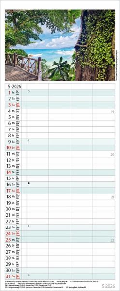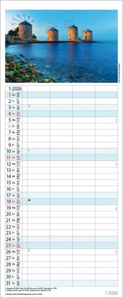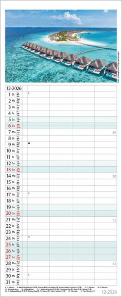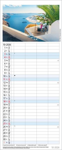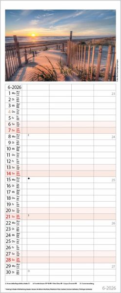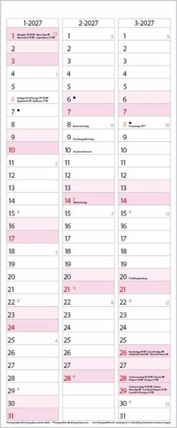 Übersichtlicher Familienplaner mit 4 großen Spalten; sehr stabile Rückwand; 19 x 46 cm Terminkalender mit viel Platz für Eintragungen, ohne störende Bilder in den Spalten leichte Beschreibbarkeit, auch mit Bunt- und Bleistiften Deutsches Kalendarium mit regionalen Feiertagen für Deutschland, Österreich und Schweiz Farblich hervorgehobene Sonn- und Feiertage, sowie Anzeige der Zeitumstellung Gedruckt auf dickem und umweltfreundlichem FSC Papier