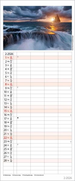 Wer auch im Alltag Meeresluft schnuppern und Sand zwischen den Zehen spüren möchte, liegt mit diesem maritimen Familienplaner genau richtig. Die stimmungsvollen Fotos bringen frischen Wind ins Zuhause und stillen die Sehnsucht nach Meer und Küste. Mit 4 Spalten, extra Müllspalte sowie Ferienterminen und Vorschau bis März des Folgejahres.