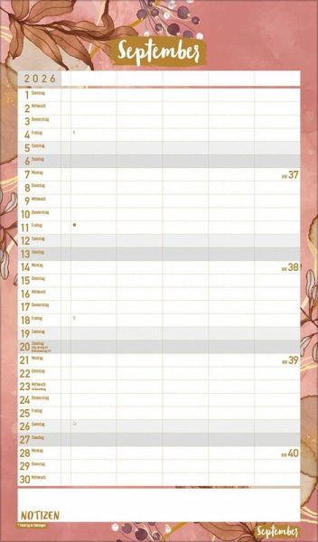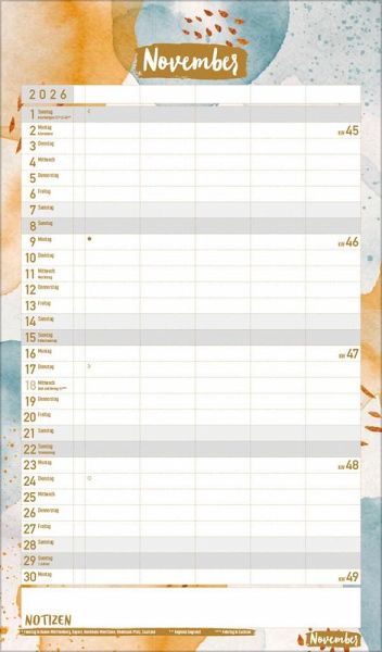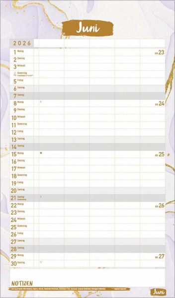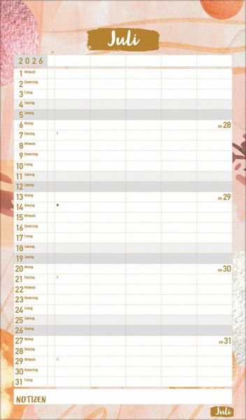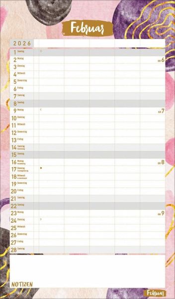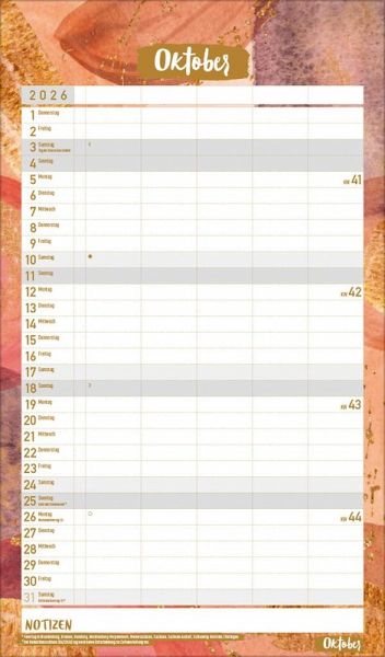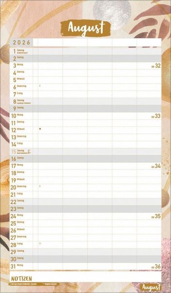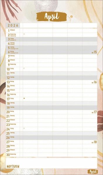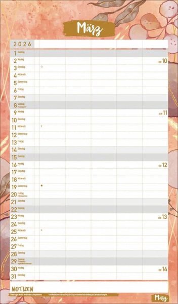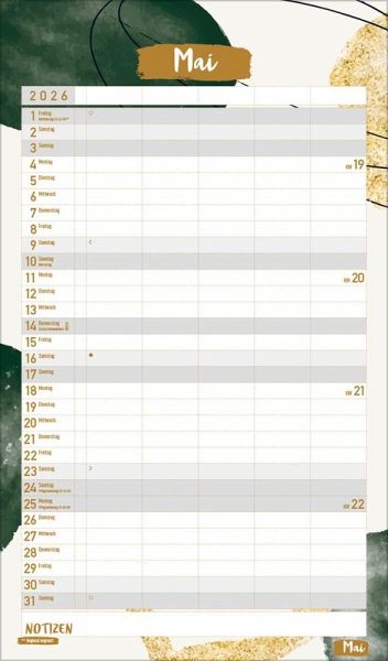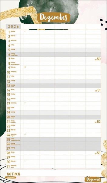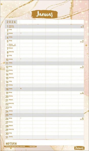 Übersichtlicher Familienplaner, 5 große Spalten; Format: 27x46 cm Druck mit Metallic-Farbe für echten Glanz; stabile Rückwand Viel Platz für Eintragungen, ohne störende Bilder in den Spalten leichte Beschreibbarkeit, auch mit Bunt- und Bleistiften Deutsches Kalendarium mit regionalen Feiertagen für D, A und CH Praktische Zusatzspalte für Ferien, Müll und weitere Aktivitäten Gedruckt auf dickem und umweltfreundlichem FSC Papier