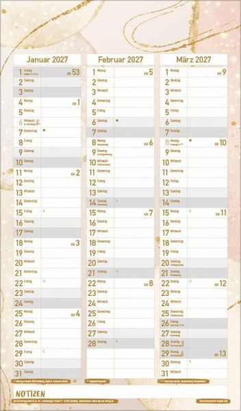 Bringen Sie Glamour in Ihren Alltag! Edles Schwarz trifft auf glänzende Metallic-Farben und Trend-Designs. Setzen Sie Ihre Termine glamourös in Szene und profitieren Sie zugleich von der hohen Funktionalität eines modernen Terminplaners: 5 Spalten, praktische Zusatzspalte für Ferien, Müll und weitere Aktivitäten, Kalendarium mit Notizfeld, Ferientermine und Vorschau bis März des Folgejahres.