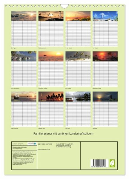 QUALITÄT - Hochwertiger Fotokalender mit 12 wunderschönen Motiven auf lichtbeständigem Bilderdruckpapier, robuste Spiralbindung mit Aufhängebügel.NACHHALTIG - deutliche Abfallreduzierung durch bedarfsgerechte Einzelstückfertigung, umweltfreundliches FSC-zertifiziertes Papier, Produktion in Deutschland, klimabewusste Logistik.PERFEKTES GESCHENK - Kalender für Freunde und Familie, für Kinder und Erwachsene, jung und alt, zu Weihnachten, Geburtstag oder zwischendurch.VIELFALT - Bildkalender in verschiedenen Formaten, z.B. DIN A5, DIN A4, DIN A3 sowie DIN A2. Ob Naturmotiv, Gemälde oder Fotos, ideal für ein persönliches Wohlfühlambiente.Familienplaner mit Schönen Landschaftsbildern von Autor(in): Klaus Dieter Schulze