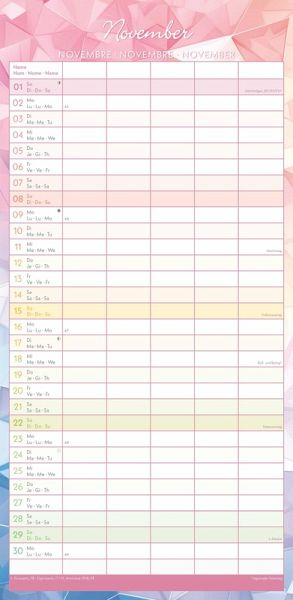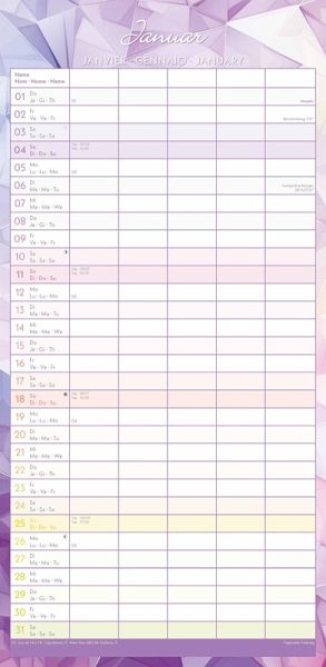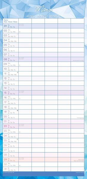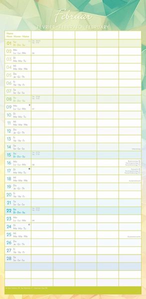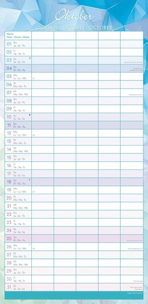 Praktisches Format 22 x 45 cm ideal für Küche, Flur oder Familienzimmer5 Spalten für individuelle Namen & Termine übersichtlich & familienfreundlich4-sprachiges Kalendarium (Deutsch, Englisch, Französisch, Italienisch)Feiertage für Deutschland, Österreich & Schweiz integriertExtras: Schulferienübersicht (alle Bundesländer), Jahresvorschau 2027, StundenpläneMit farbigem Stickerbogen zur Markierung besonderer AnlässeNachhaltig: klimafreundlich gedruckt auf robustem Offset-Papier perfekt beschreibbar mit Bleistift, Kugelschreiber oder MarkerPraktische Spiralbindung für einfaches Blättern