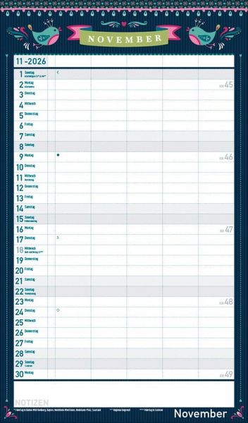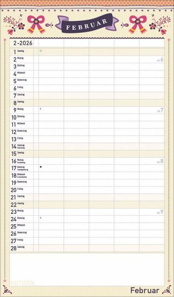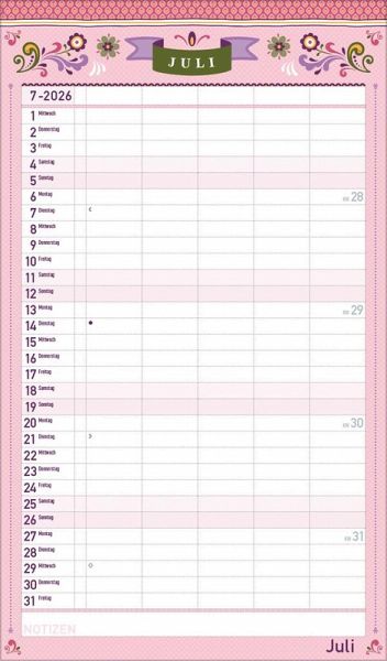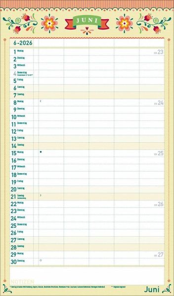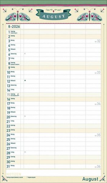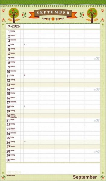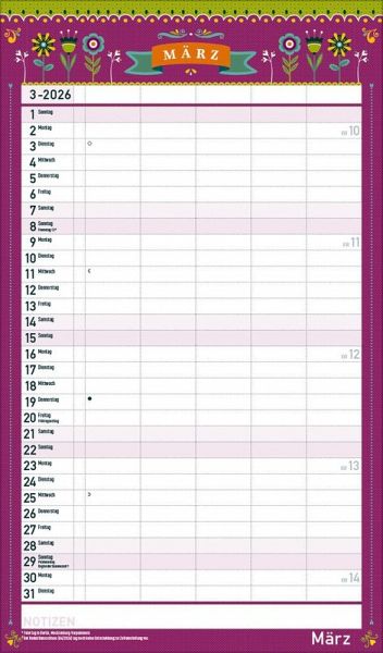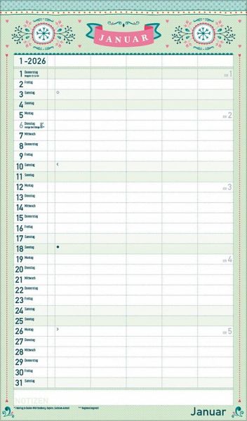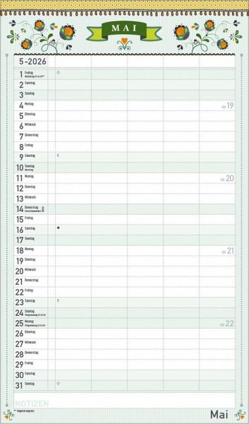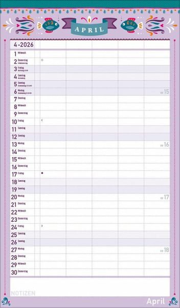 Übersichtlicher Familienplaner für bis zu 5 Personen; sehr stabile Rückwand Praktische Zusatzspalte für Ferien, Müll und weitere Aktivitäten Terminplaner ohne störende Bilder in den Spalten Viel Platz für Eintragungen, leichte Beschreibbarkeit, auch mit Bunt- und Bleistiften Deutsches Kalendarium mit regionalen Feiertagen für Deutschland, Österreich und Schweiz Extra Platz für Notizen unter dem Kalendarium Gedruckt auf umweltfreundlichem FSC Papier