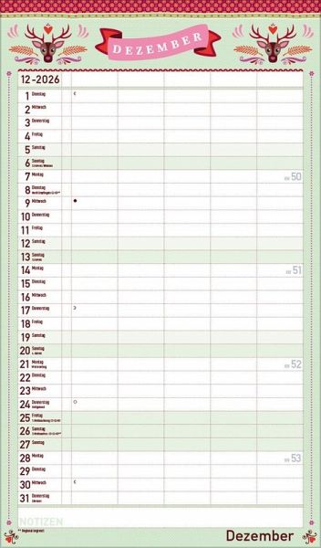 Dekorativer Familientimer im angesagten Vintage-Stil - mit vielen Details liebevoll gestaltet von Mo Büdinger. Mit fünf Spalten zum Eintragen von Geburtstagen, Terminen und Erinnerungen bietet der Multiplaner viel Platz für Notizen. Damit ist es auch möglich mehrere Termine in einen Tag zu schreiben. Der Organisation des Alltagsvon großen und kleinen Familien steht somit nix mehr im Weg. Neben dem gesamten Kalenderjahr enthält der Wandplaner auch eine Vorschau bis März des Folgejahres.