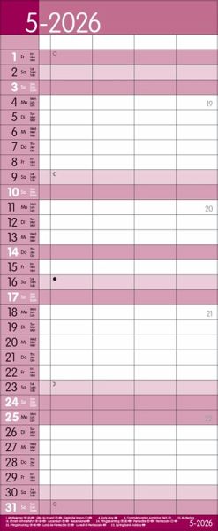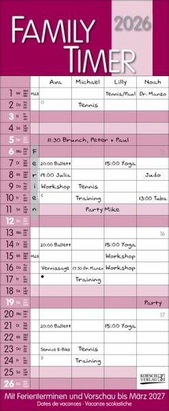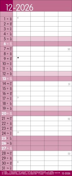 Übersichtlicher Familienplaner mit 4 großen Spalten; sehr stabile Rückwand; 19 x 46 cm Terminkalender mit viel Platz für Eintragungen, ohne störende Bilder in den Spalten leichte Beschreibbarkeit, auch mit Bunt- und Bleistiften Mehrsprachiges Kalendarium (d,e,f,i) mit regionalen Feiertagen für Deutschland, Österreich und Schweiz Farblich hervorgehobene Sonn- und Feiertage, sowie Anzeige der Zeitumstellung Gedruckt auf dickem und umweltfreundlichem FSC Papier