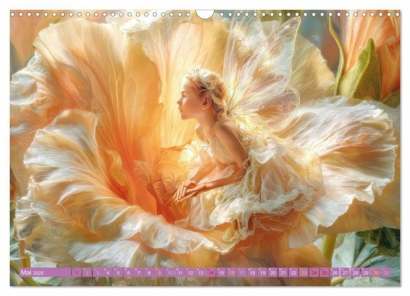 Mai:Kleines Elfenmädchen sitzt in einer Blüte