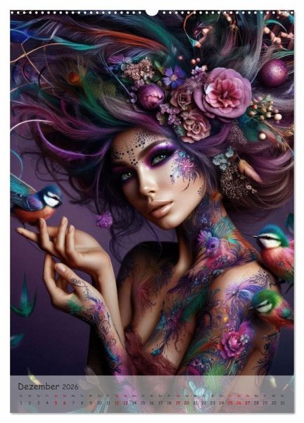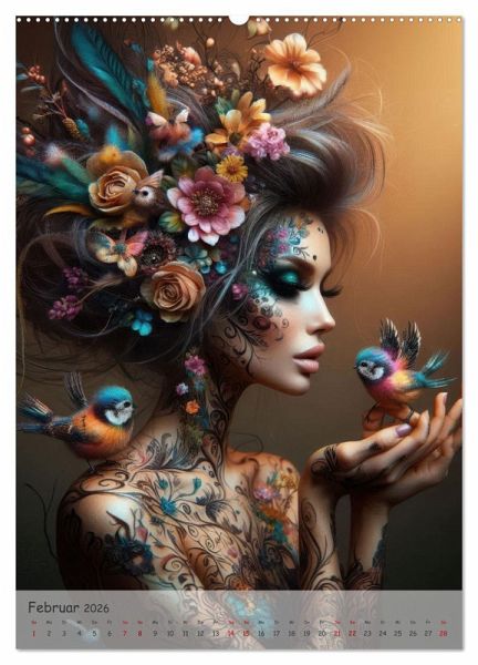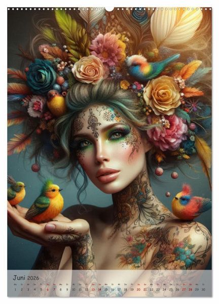 Tauchen Sie ein in eine Welt voller Magie und Fantasie mit diesem Kalender "Fantasievolle Frauenporträts - Blütenzauber und Paradiesvögel". Lassen Sie sich verzaubern von atemberaubenden KI gestaltenten Bildern, die Frauen mit kunstvoll gestalteten, organischen Haarkreationen und fantasievollen Tattoos zeigen, geschmückt mit Blüten, Federn und anderen natürlichen Elementen. Jede Seite enthüllt eine neue Szene, in der Paradiesvögel sanft auf den Händen der Frauen ruhen, und entführt Sie in eine Traumwelt voller Farben und Schönheit.