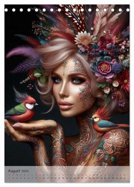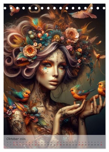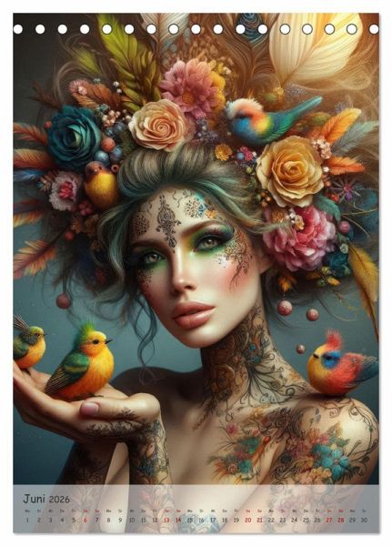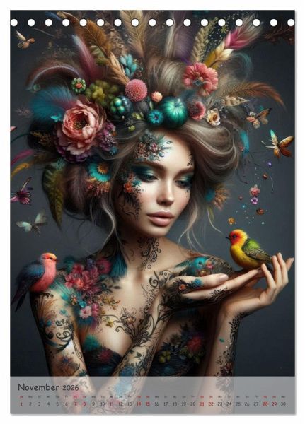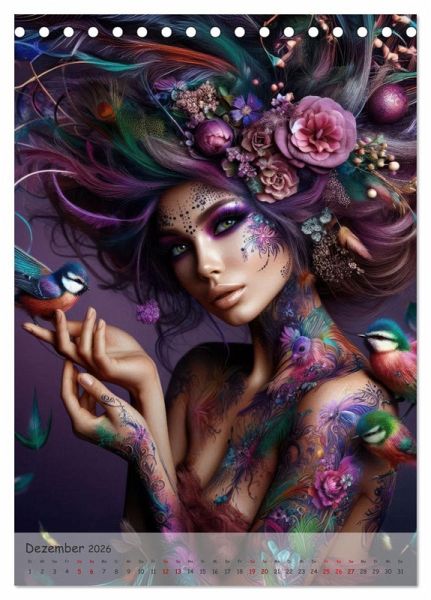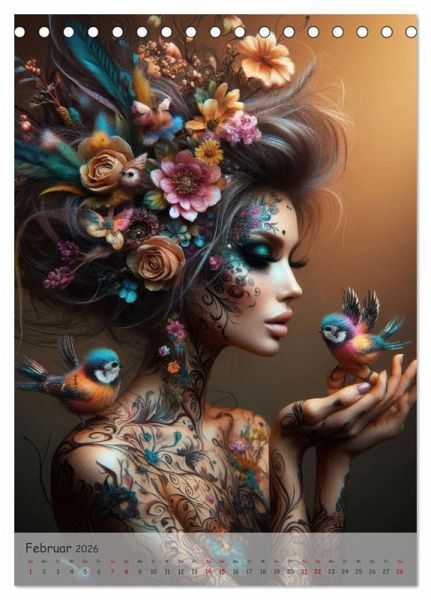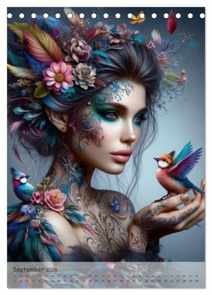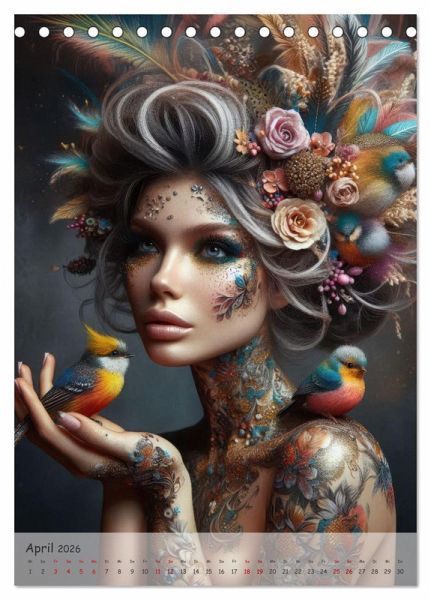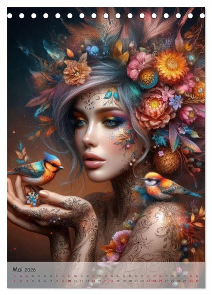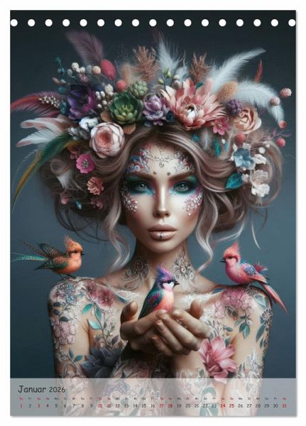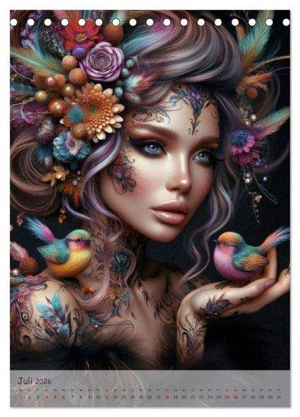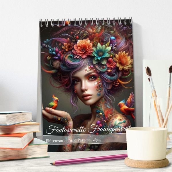 Tauchen Sie ein in eine Welt voller Magie und Fantasie mit diesem Kalender "Fantasievolle Frauenporträts - Blütenzauber und Paradiesvögel". Lassen Sie sich verzaubern von atemberaubenden KI gestaltenten Bildern, die Frauen mit kunstvoll gestalteten, organischen Haarkreationen und fantasievollen Tattoos zeigen, geschmückt mit Blüten, Federn und anderen natürlichen Elementen. Jede Seite enthüllt eine neue Szene, in der Paradiesvögel sanft auf den Händen der Frauen ruhen, und entführt Sie in eine Traumwelt voller Farben und Schönheit.
