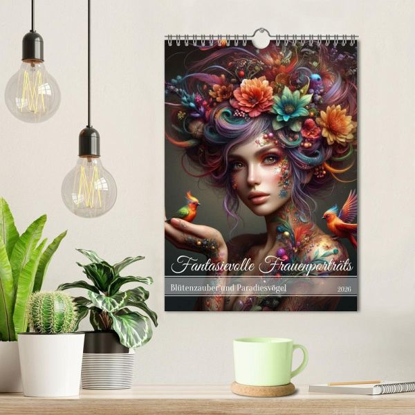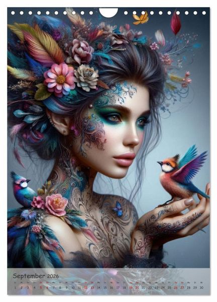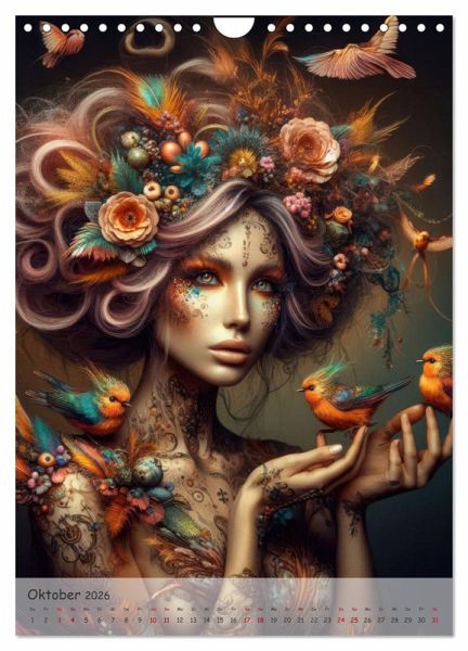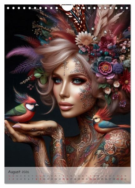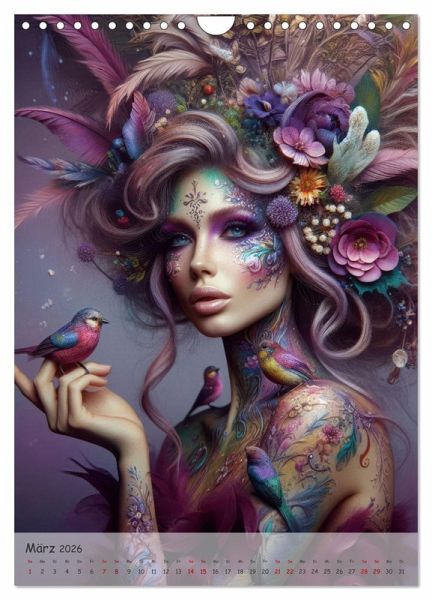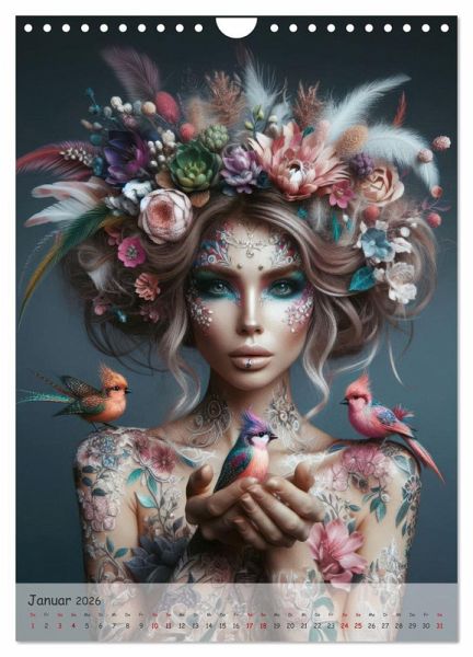 Tauchen Sie ein in eine Welt voller Magie und Fantasie mit diesem Kalender "Fantasievolle Frauenporträts - Blütenzauber und Paradiesvögel". Lassen Sie sich verzaubern von atemberaubenden KI gestaltenten Bildern, die Frauen mit kunstvoll gestalteten, organischen Haarkreationen und fantasievollen Tattoos zeigen, geschmückt mit Blüten, Federn und anderen natürlichen Elementen. Jede Seite enthüllt eine neue Szene, in der Paradiesvögel sanft auf den Händen der Frauen ruhen, und entführt Sie in eine Traumwelt voller Farben und Schönheit.