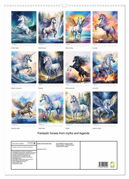 QUALITY - High-quality photo calendar with 12 beautiful images on light-resistant paper, robust spiral binding with hanger.SUSTAINABLE - Significant waste reduction due to print-on-demand production, environmentally friendly FSC-certified paper, produced in the UK, climate-conscious logistical processes.PERFECT GIFT - calendars for friends and family, for children, all ages and all occasions, from Christmas to birthdays and everything in between.LOTS OF CHOICE - Wall calendars in different sizes (DIN A4 and DIN A3), for any topic and personal taste, featuring photography, painting and illustrations.Magical paintings ofunicorns and other mystic horses from fabulous tales, author: Stephanie Kohrt