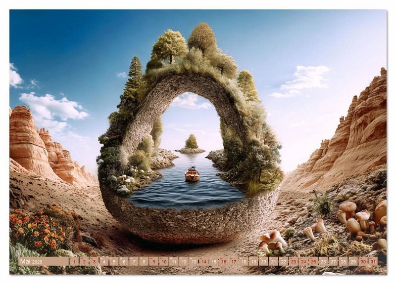 In diesem Kalender erwachen Gedanken zu Landschaften: Zwölf surreal anmutende Szenen, erschaffen mit Hilfe künstlicher Intelligenz, zeigen eine Welt, in der das Unmögliche selbstverständlich scheint. Schwebende Felsen, verwachsene Pilzarchitektur, stille Wasserflächen und imaginäre Vegetationen fügen sich zu poetischen Bildkompositionen, die Natur und Fantasie neu denken. Diese KI-generierten Werke laden zum Innehalten, Staunen und Weiterträumen ein - ein visuelles Erlebnis für alle, die sich gern abseits der Realität bewegen.