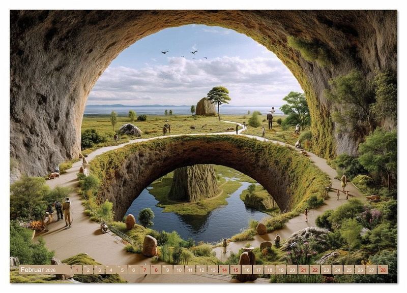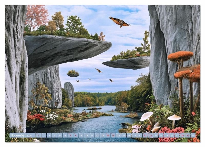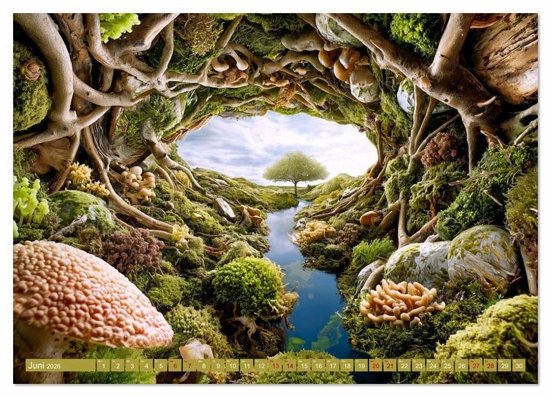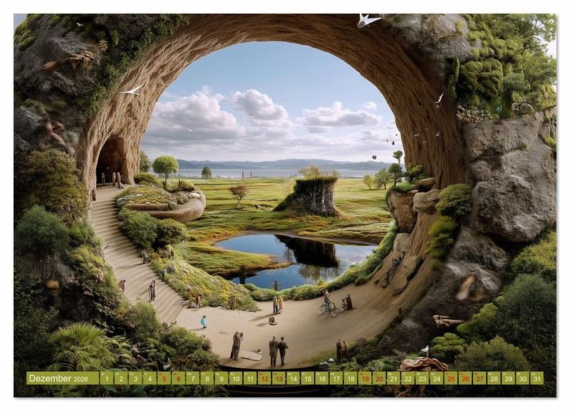 In diesem Kalender erwachen Gedanken zu Landschaften: Zwölf surreal anmutende Szenen, erschaffen mit Hilfe künstlicher Intelligenz, zeigen eine Welt, in der das Unmögliche selbstverständlich scheint. Schwebende Felsen, verwachsene Pilzarchitektur, stille Wasserflächen und imaginäre Vegetationen fügen sich zu poetischen Bildkompositionen, die Natur und Fantasie neu denken. Diese KI-generierten Werke laden zum Innehalten, Staunen und Weiterträumen ein - ein visuelles Erlebnis für alle, die sich gern abseits der Realität bewegen.
