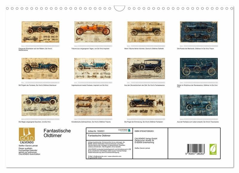 Dieser qualitativ hochwertige Kalender gehört zur exklusiven CALVENDO Gold-Edition. Ob Sie ein Liebhaber von klassischen Autos sind oder einfach nur die Magie vergangener Zeiten erleben möchten, unsere Oldtimer im Da Vinci Stil versprechen eine Fahrt, die nicht nur den Geist, sondern auch die Sinne belebt. Tauchen Sie ein in eine Welt, in der Kunst und Mobilität zu einem harmonischen Tanz verschmelzen - willkommen in einer Ära des Fahrens, die Sie nie vergessen werden. Alle hier gezeigten Bilder wurden mit Sorgfalt, Liebe und mit Hilfe einer KI generiert. Abschließend werden sie mit Bildbearbeitungsprogrammen überarbeitet und in den Kalender eingefügt.