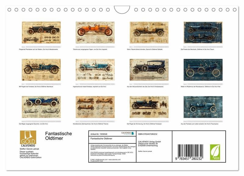 Dieser qualitativ hochwertige Kalender gehört zur exklusiven CALVENDO Gold-Edition. Ob Sie ein Liebhaber von klassischen Autos sind oder einfach nur die Magie vergangener Zeiten erleben möchten, unsere Oldtimer im Da Vinci Stil versprechen eine Fahrt, die nicht nur den Geist, sondern auch die Sinne belebt. Tauchen Sie ein in eine Welt, in der Kunst und Mobilität zu einem harmonischen Tanz verschmelzen - willkommen in einer Ära des Fahrens, die Sie nie vergessen werden. Alle hier gezeigten Bilder wurden mit Sorgfalt, Liebe und mit Hilfe einer KI generiert. Abschließend werden sie mit Bildbearbeitungsprogrammen überarbeitet und in den Kalender eingefügt.