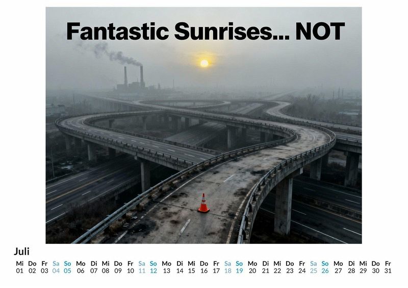 Einleitung Vergessen Sie leuchtende Farben und idyllische Landschaften. Der Kalender "Fantastische Sonnenaufgänge... NOT" bricht mit der Tradition postkartenschöner Motive. Er zelebriert die ungeschönte Ästhetik des Alltags und zeigt, was viele Menschen morgens wirklich sehen: den grauen Himmel über urbanen und industriellen Szenerien. Eine ehrliche Darstellung des Tagesanbruchs, fernab jeglicher Romantisierung. Dieser Kalender ist optimal geeignet für: * Menschen mit einem ausgeprägten Sinn für Ironie und schwarzen Humor. * Realisten, die die Schönheit im Unspektakulären finden. * Alle, die ein originelles Geschenk abseits des Mainstreams suchen. Kurzer beschreibender Text Jeder Monat präsentiert eine neue Facette des urbanen Erwachens. Dichter Nebel schleicht um Silos, blasses Licht bricht durch den Dunst über Fabrikschloten und Betonlandschaften liegen in der stillen Monotonie des frühen Morgens. Die Motive, die den Berechnungen eines komplexen Systems entspringen, fangen eine Stimmung ein, die zwischen Melancholie und roher Wirklichkeit pendelt. Es ist eine Hommage an die unbesungenen Momente des Tagesanbruchs. Was der Kunde erwarten kann: * Zwölf Monatsblätter mit Motiven von nebligen Sonnenaufgängen. * Ein Kalendarium für die Organisation von Terminen. * Eine konsequente Abkehr von klassischen Landschaftsfotografien. Zusammenfassung und motivierende Aufforderung zum Anschauen des Kalenders Der Kalender "Fantastische Sonnenaufgänge... NOT" ist mehr als nur ein Zeitplaner. Er ist ein humorvoller Kommentar zur idealisierten Darstellung der Natur und eine Ode an die Ästhetik des Alltäglichen. Ein Stück ehrliche Realität für die Wand, das jeden Monat aufs Neue zum Schmunzeln und Nachdenken anregt. Es lohnt sich, die einzelnen Monatsansichten zu betrachten und sich auf diese besondere Perspektive einzulassen.