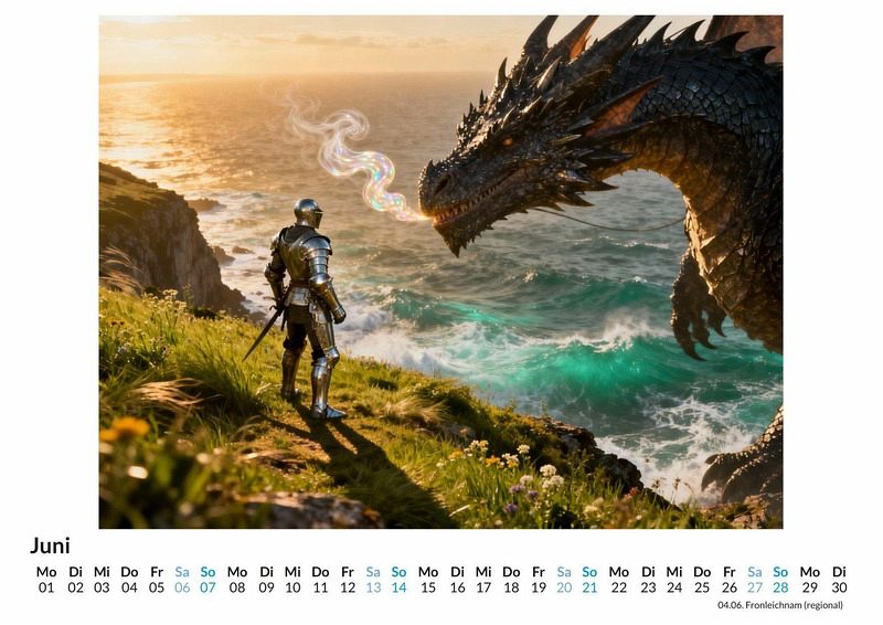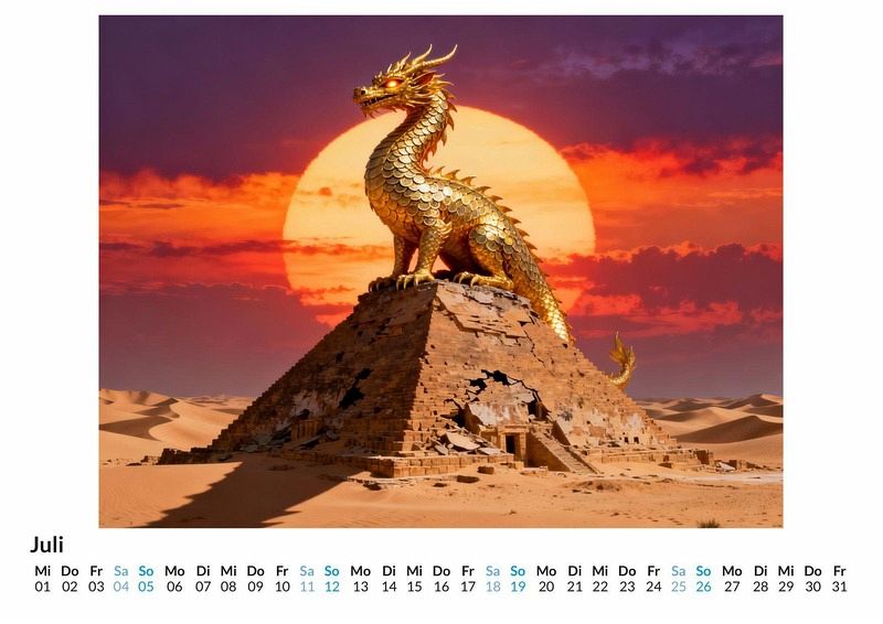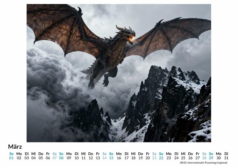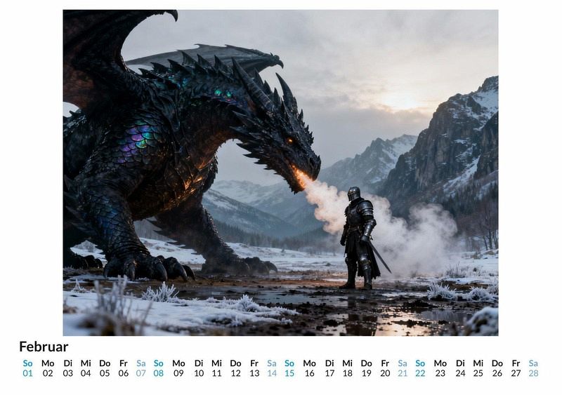 Machtkämpfe erschüttern die Königreiche, während Drachenfeuer den Himmel erleuchtet und Ritter in eisernen Rüstungen für ihre Häuser kämpfen. Dieser Kalender fängt die düstere und faszinierende Atmosphäre dieser Welt in zwölf einzigartigen Motiven ein. Der Kalender ist eine ideale Wahl: Für Liebhaber von epischen Fantasy-Geschichten voller Intrigen und Schlachten. Für alle, die die Ästhetik von Burgen, Drachen und mittelalterlichen Landschaften schätzen. Für jene, die einen Wandschmuck suchen, der Monat für Monat eine Geschichte erzählt. Jedes Monatsblatt des Kalenders "Fantasy-Serie mit Drachen & Rittern" präsentiert eine Szene, die von den ikonischen Momenten und Charakteren der Saga inspiriert ist. Von schneebedeckten Festungen im Norden bis zu sonnenverbrannten Wüsten im Süden, von majestätischen Drachen im Flug bis zu einsamen Thronen in großen Hallen. Die Motive wurden von einem kreativen Algorithmus erdacht und digital zum Leben erweckt, was ihnen eine besondere, fast surreale Anmutung verleiht. Was der Kalender bietet: Zwölf Monatsmotive aus der Welt der Drachen und Ritter. Ein praktisches Kalendarium für die Organisation des Alltags. Ein Wandkalender, der in jedem Raum einen visuellen Akzent setzt. Der Kalender begleitet durch das Jahr mit Bildern, die von Verrat, Ehre und dem unerbittlichen Streben nach Macht erzählen. Eine Reise durch die Königreiche erwartet den Betrachter. Es lohnt sich, die einzelnen Monatsansichten zu entdecken.