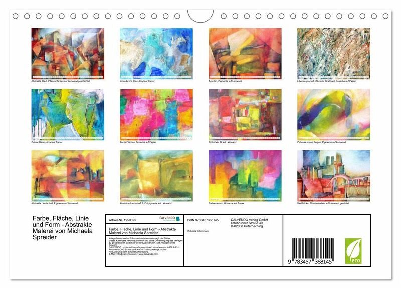 Dabei stehen dem Künstler, neben dem Gefühl, Elemente wie Farbe, Fläche, Linie und Form zur Verfügung. Mit diesen komponiert er wie mit Gewürzen seinen ganz eigenen Bildausdruck. Dieser Kalender zeigt 12 abstrakte Arbeiten von Michaela Spreider (_ 1972 in München), Kunsttherapeutin und Künstlerin.