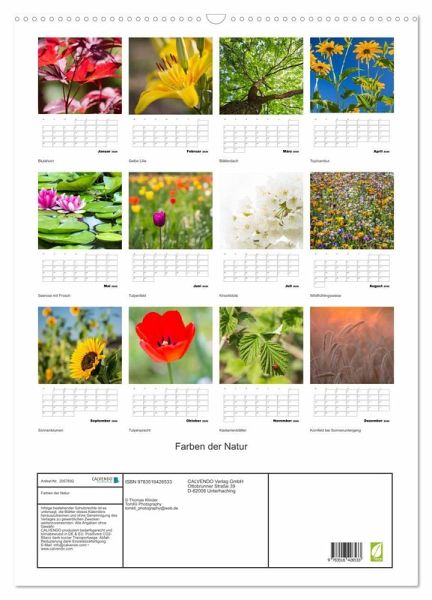 QUALITÄT - Hochwertiger Fotokalender mit 12 wunderschönen Motiven auf lichtbeständigem Bilderdruckpapier, robuste Spiralbindung mit Aufhängebügel.NACHHALTIG - deutliche Abfallreduzierung durch bedarfsgerechte Einzelstückfertigung, umweltfreundliches FSC-zertifiziertes Papier, Produktion in Deutschland, klimabewusste Logistik.PERFEKTES GESCHENK - Kalender für Freunde und Familie, für Kinder und Erwachsene, jung und alt, zu Weihnachten, Geburtstag oder zwischendurch.VIELFALT - Bildkalender in verschiedenen Formaten, z.B. DIN A5, DIN A4, DIN A3 sowie DIN A2. Ob Naturmotiv, Gemälde oder Fotos, ideal für ein persönliches Wohlfühlambiente.Farben für die Seele! Jede Farbe hat eine Wirkung und nimmt Einfluss auf unsere Gefühle und unsere Stimmung. von Autor(in): TomKli