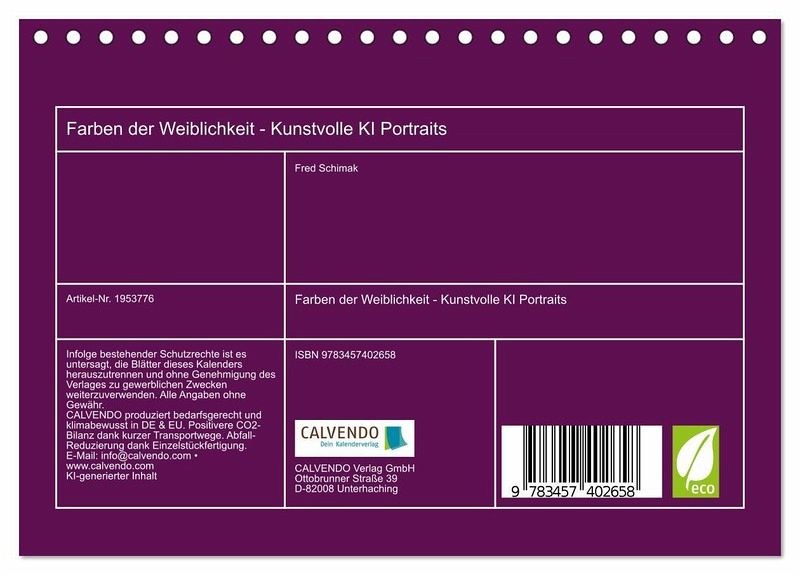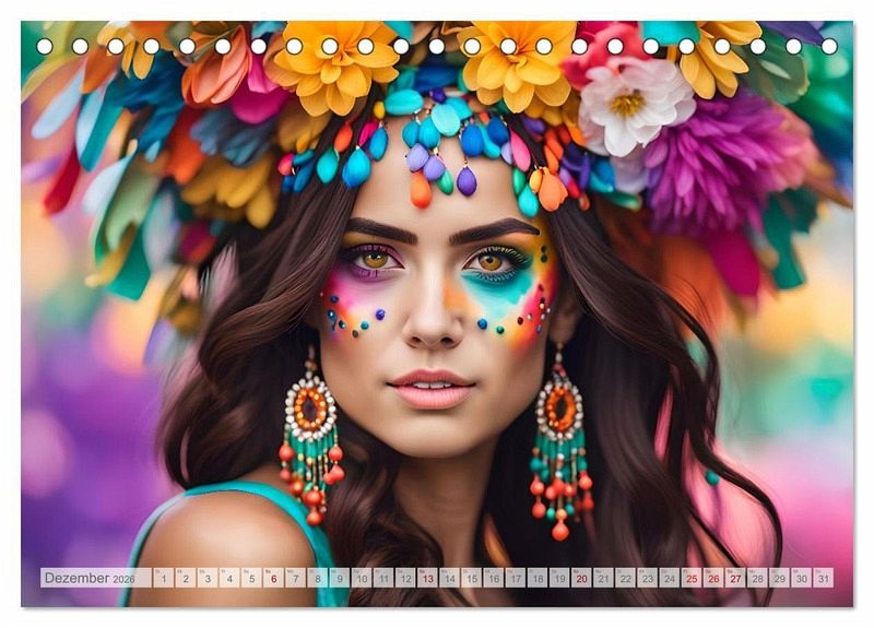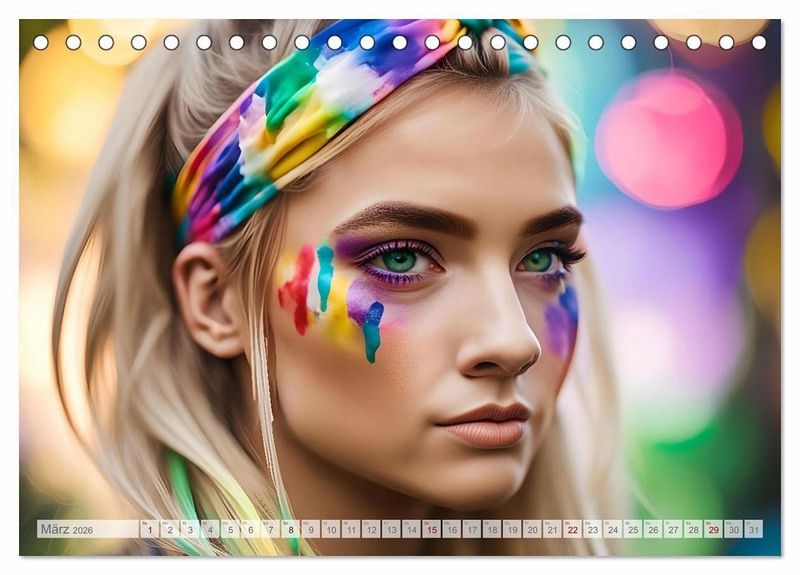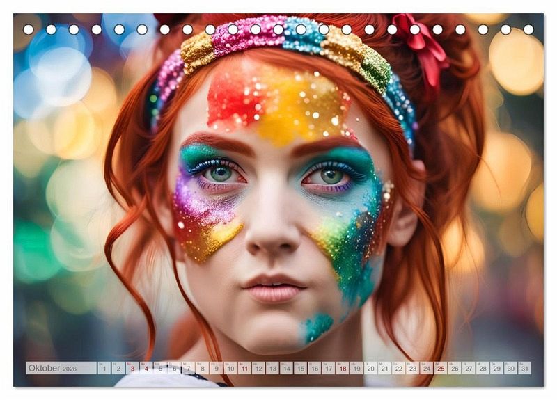 Entdecke die faszinierende Vielfalt der Weiblichkeit in unserem Kalender "Farben der Weiblichkeit". Tauche ein in eine Welt kunstvoller KI-Portraits, die die Schönheit und Sinnlichkeit der Frau in lebendigen Farben widerspiegeln. Jedes Bild zeigt wunderschöne Frauen mit kreativ bemalten Gesichtern und buntem Haarschmuck, die eine ganz eigene Geschichte erzählen. Lass dich von ihrer Ausdrucksstärke und Individualität inspirieren, während du durch das Jahr gehst.