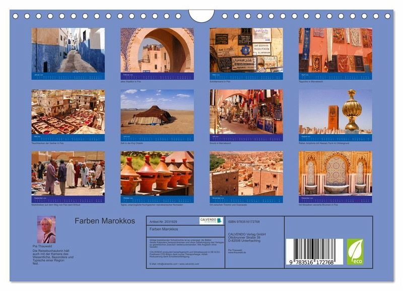 QUALITÄT - Hochwertiger Fotokalender mit 12 wunderschönen Motiven auf lichtbeständigem Bilderdruckpapier, robuste Spiralbindung mit Aufhängebügel.NACHHALTIG - deutliche Abfallreduzierung durch bedarfsgerechte Einzelstückfertigung, umweltfreundliches FSC-zertifiziertes Papier, Produktion in Deutschland, klimabewusste Logistik.PERFEKTES GESCHENK - Kalender für Freunde und Familie, für Kinder und Erwachsene, jung und alt, zu Weihnachten, Geburtstag oder zwischendurch.VIELFALT - Bildkalender in verschiedenen Formaten, z.B. DIN A5, DIN A4, DIN A3 sowie DIN A2. Ob Naturmotiv, Gemälde oder Fotos, ideal für ein persönliches Wohlfühlambiente.Marokko bleibt dem Reisenden in vielerlei Hinsicht in Erinnerung; aufsaugen wird er in jedem Fall eine kaum für möglich gehaltene Farbenvielfalt und -intensität. von Autor(in): Pia Thauwald