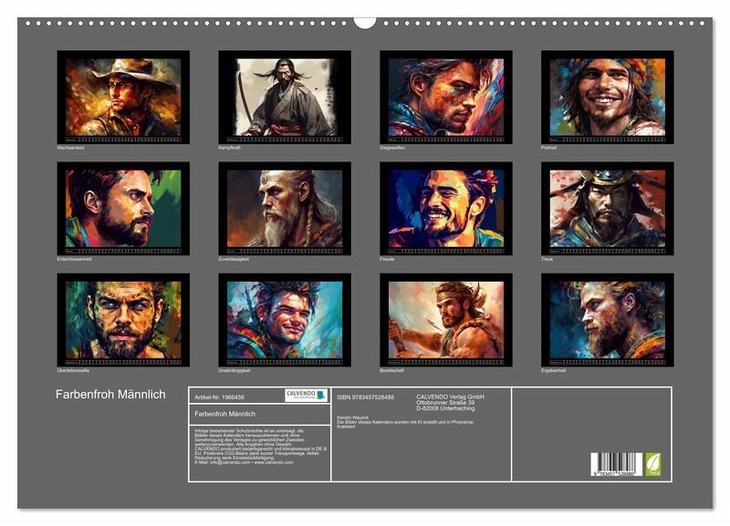 Ein farbenfroher Kalender mit Portraits von Männern, die im Leben ihre Aufgaben gefunden haben und sie entschlossen erfüllen. Auch wenn diese Portraits nicht von realen Menschen sind, so hat die KI doch einfangen können, was wir an Männern lieben und was wir in ihnen sehen. Lassen Sie sich ein Jahr lang begleiten von der Kraft des Männlichen, als Ergänzung zum Weiblichen. So wie es den Kalender "Farbenfroh Weiblich" gibt, so rundet dieser das Gesamtbild ab. Die Bilder wurden von einer KI erstellt und in Photoshop finalisiert.