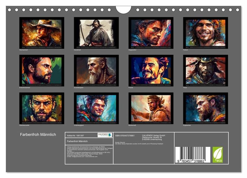 Ein farbenfroher Kalender mit Portraits von Männern, die im Leben ihre Aufgaben gefunden haben und sie entschlossen erfüllen. Auch wenn diese Portraits nicht von realen Menschen sind, so hat die KI doch einfangen können, was wir an Männern lieben und was wir in ihnen sehen. Lassen Sie sich ein Jahr lang begleiten von der Kraft des Männlichen, als Ergänzung zum Weiblichen. So wie es den Kalender "Farbenfroh Weiblich" gibt, so rundet dieser das Gesamtbild ab. Die Bilder wurden von einer KI erstellt und in Photoshop finalisiert.