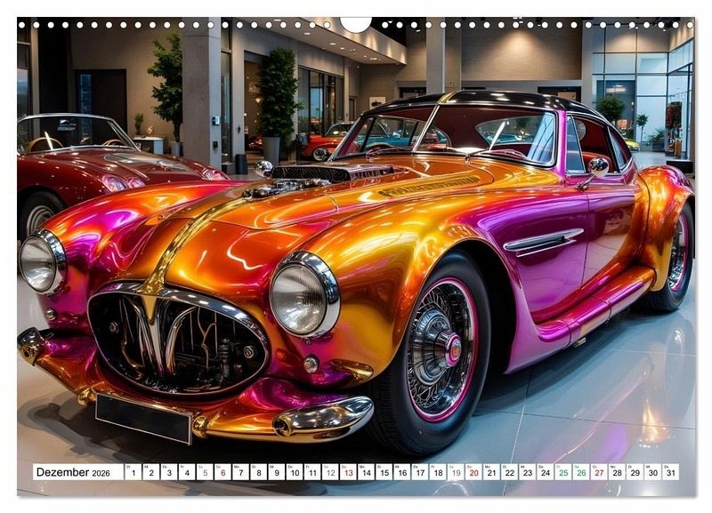 Spektakuläre Kunst auf vier Rädern: In "Farbenfrohe Lackvisionen" verschmelzen radikale Umbauten mit außergewöhnlichen Lackierungen zu echten Traumwagen. Jeder Monat präsentiert ein einzigartiges, KI-generiertes Showcar - geslammt, gechoppt und mit den wildesten Farbverläufen veredelt. Diese Fahrzeuge trotzen jeder Norm und glänzen als Vision extremer Fahrzeugkunst in luxuriösen Showräumen. Perfekt für alle, die kreatives Automobildesign lieben und sich von individueller Technik und Lackkunst inspirieren lassen möchten. Hier wird jede Seite zum Blickfang für Individualisten und…mehr