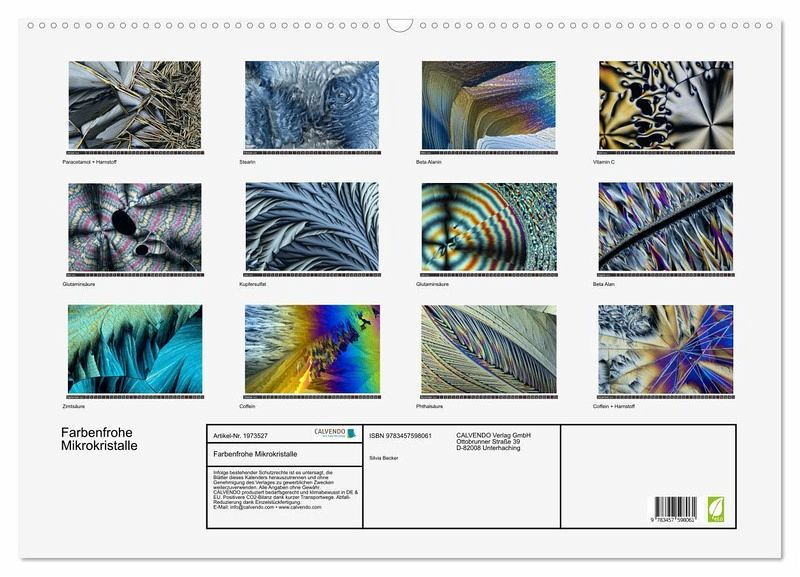 QUALITÄT - Hochwertiger Fotokalender mit 12 wunderschönen Motiven auf lichtbeständigem Bilderdruckpapier, robuste Spiralbindung mit Aufhängebügel.NACHHALTIG - deutliche Abfallreduzierung durch bedarfsgerechte Einzelstückfertigung, umweltfreundliches FSC-zertifiziertes Papier, Produktion in Deutschland, klimabewusste Logistik.PERFEKTES GESCHENK - Kalender für Freunde und Familie, für Kinder und Erwachsene, jung und alt, zu Weihnachten, Geburtstag oder zwischendurch.VIELFALT - Bildkalender in verschiedenen Formaten, z.B. DIN A5, DIN A4, DIN A3 sowie DIN A2. Ob Naturmotiv, Gemälde oder Fotos, ideal für ein persönliches Wohlfühlambiente.Erfreuen Sie sich an der wunderbar farbigen Welt der Mikrokristalle in all ihrer Schönheit. von Autor(in): Silvia Becker
