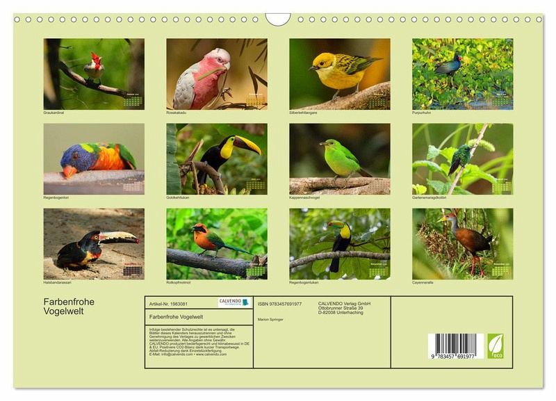 QUALITÄT - Hochwertiger Fotokalender mit 12 wunderschönen Motiven auf lichtbeständigem Bilderdruckpapier, robuste Spiralbindung mit Aufhängebügel.NACHHALTIG - deutliche Abfallreduzierung durch bedarfsgerechte Einzelstückfertigung, umweltfreundliches FSC-zertifiziertes Papier, Produktion in Deutschland, klimabewusste Logistik.PERFEKTES GESCHENK - Kalender für Freunde und Familie, für Kinder und Erwachsene, jung und alt, zu Weihnachten, Geburtstag oder zwischendurch.VIELFALT - Bildkalender in verschiedenen Formaten, z.B. DIN A5, DIN A4, DIN A3 sowie DIN A2. Ob Naturmotiv, Gemälde oder Fotos, ideal für ein persönliches Wohlfühlambiente.Wunderschöne Vögel aus dem Farbkasten der Natur von Autor(in): Marion Springer