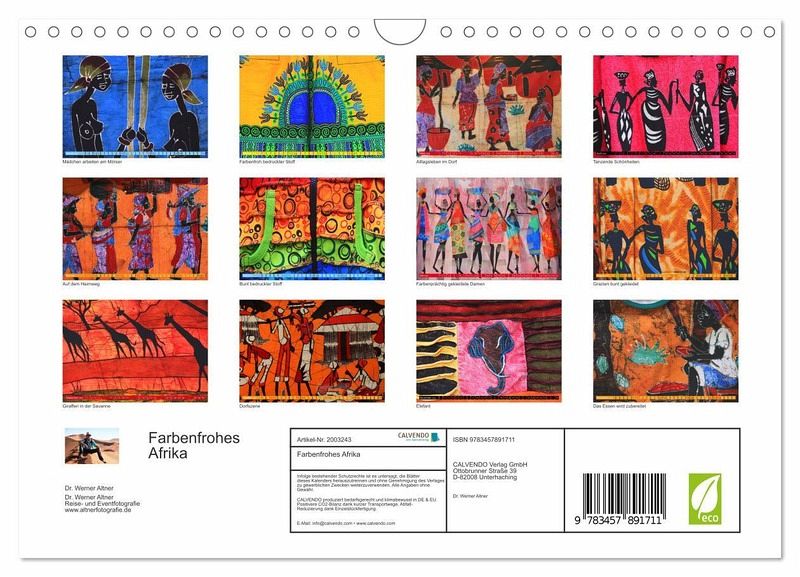 QUALITÄT - Hochwertiger Fotokalender mit 12 wunderschönen Motiven auf lichtbeständigem Bilderdruckpapier, robuste Spiralbindung mit Aufhängebügel.NACHHALTIG - deutliche Abfallreduzierung durch bedarfsgerechte Einzelstückfertigung, umweltfreundliches FSC-zertifiziertes Papier, Produktion in Deutschland, klimabewusste Logistik.PERFEKTES GESCHENK - Kalender für Freunde und Familie, für Kinder und Erwachsene, jung und alt, zu Weihnachten, Geburtstag oder zwischendurch.VIELFALT - Bildkalender in verschiedenen Formaten, z.B. DIN A5, DIN A4, DIN A3 sowie DIN A2. Ob Naturmotiv, Gemälde oder Fotos, ideal für ein persönliches Wohlfühlambiente.Afrikas Leben mit Farbe in Szene gesetzt von Autor(in): Dr. Werner Altner